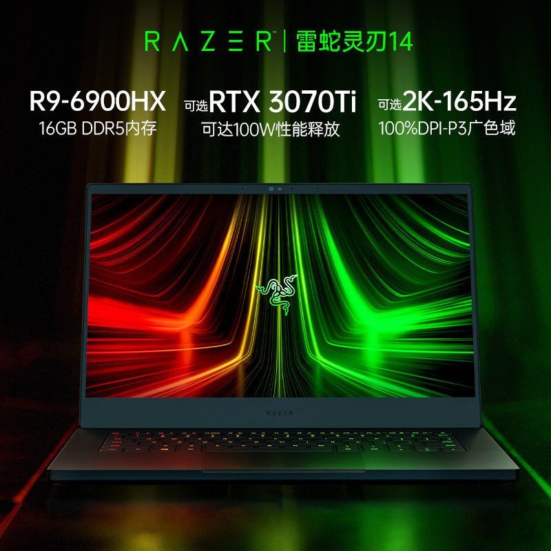 在配置方面,采用全新一代AMD R9-6900HX处理器,45W标压功耗,7nm制程工艺,8核16线程,至高加速频率4.9GHz,16GB DDR5 4800MHz内存,Pcle 4.0 1TB M2 SSD固态硬盘,显卡使用RTX3070ti独显,支持显卡独连,功率最高可达100W,高达100%sRGB色域。采用 Razer Chroma雷蛇幻彩防按键冲突技术的单区RGB背光键盘。电池续航方面配备61.6Wh锂离子聚合物电池。
