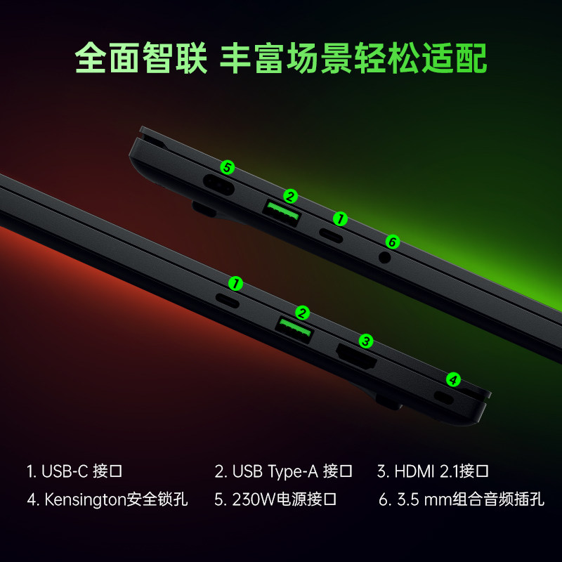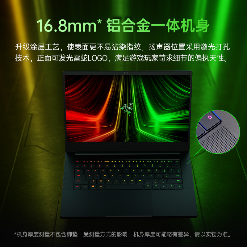在外观方面,正面发光雷蛇LOGO,采用铝合金一体材质,升级涂层工艺,使表面更不易沽染指纹,机身厚度仅为16.8mm,轻约1.78kg,屏幕方面是14英寸2K IPS屏幕,4.9mm窄边框设计,165Hz刷新率、尺寸16.8 x 220 x 319.7 mm。