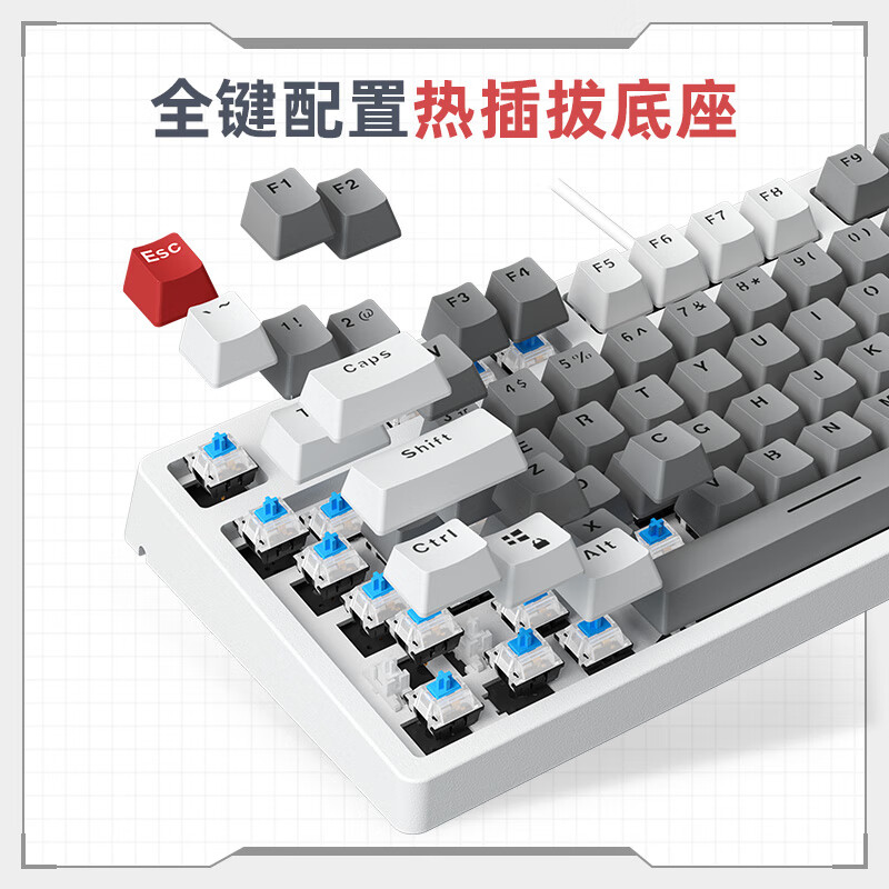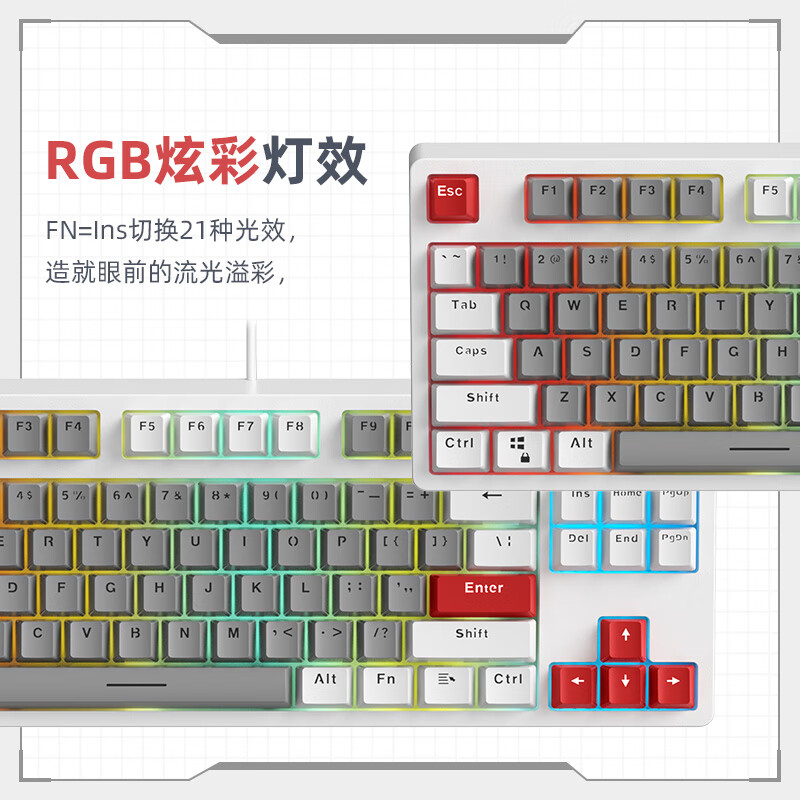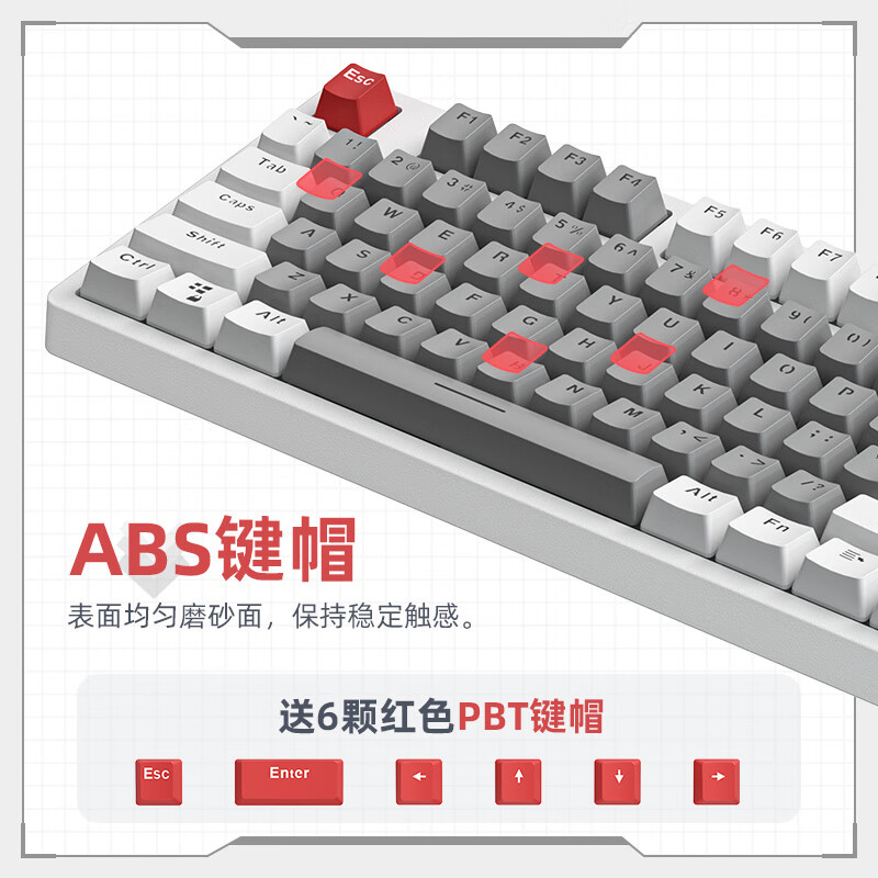 这款机械键盘采用87键布局。支持全键热插拔。标配青轴、红轴两种轴体。具备21种RGB光效。使用ABS键帽,表面均匀磨砂面,字符清晰触感细腻,附赠6颗红色PBT键帽。支持Mac/Win双系统切换。