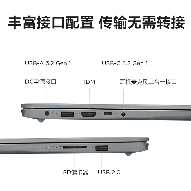 配备了USB-C、USB-A和HDMI等丰富接口,不管是外接投影大屏、接驳键鼠U盘、连接耳机,还是读取SD卡都无需转接,高效又方便。