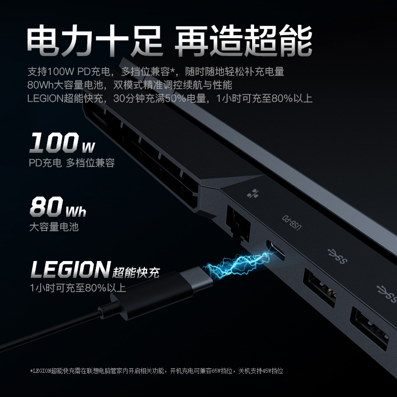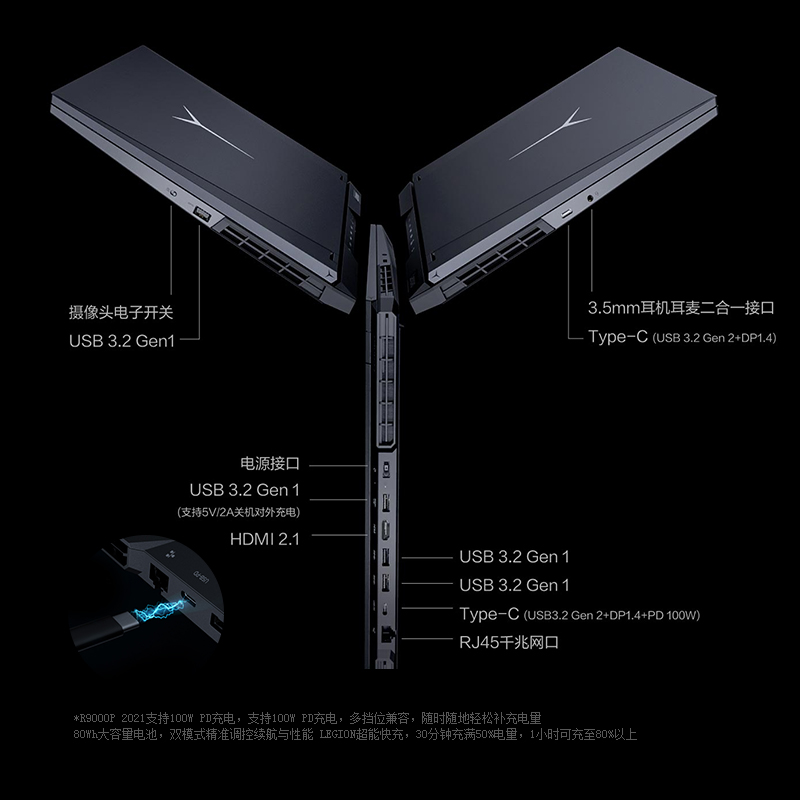 其他方面,R9000P 2021款采用了第三代霜刃散热系统,拥有全覆盖导热模组、8mm高性能复合式热管、84mm大直径涡轮风扇,配合智能控温系统,散热更高效。搭载全新的WiFi6标准双频无线网卡,最高速度可达2.4Gbps,2.4倍于千兆有线网络,完整支持MU-MIMO与OFDMA技术。80Wh大容量电池,配备300W高功率适配器,30分钟充满50%,一小时即可充至80%以上,且支持100W PD充电。搭载左右对称的扬声器,支持全景环绕。接口方面,具备4*USB-A3.2Gen1,2*USB-C(DP1.4、USB3.2Gen2,尾部C口支持PD),千兆RJ45接口,3.5mm音频接口,1*HDMI2.1接口。
