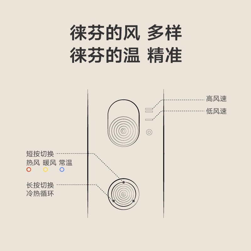 徕芬 LF03 电吹风属于第三代产品,共有六种配色可选,采用11万转高速马达,内置温度传感器及微处理器,每秒100次校准出风口温度,提供热风、暖风和自然风三种风温可选,另外配备三色灯环,出风温度一目了然;产品额定功率1600W,机身重量407g,标配顺滑风嘴,可选配扩散风嘴、集风嘴等。
