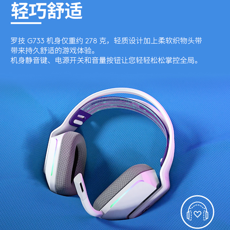 罗技(Logitech)这款头戴式无线耳机,机身重量约278g,配合柔软织物头带,体验舒适。采用LIGHTSPEED无线传输技术,连接范围约20米。支持DTS HEADPHONE:X 2.0,7.1环绕声技术,音频清晰度高。提供约1680W色的LIGHTSYNC流光灯效,通过驱动调节。