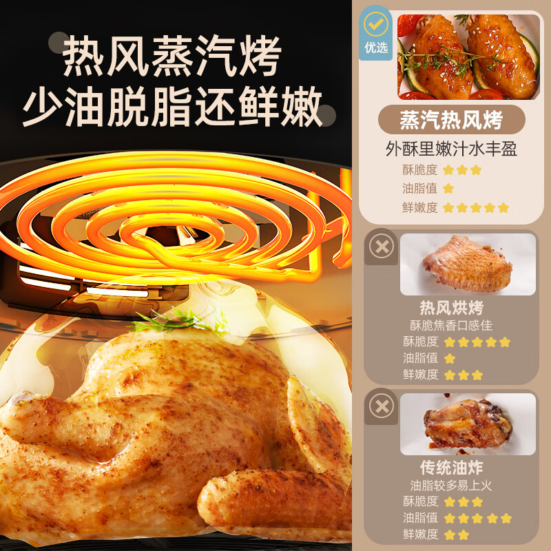 微量蒸汽形成绵密水膜,包裹食物表面,避免肉质干柴焦老。360°热风加持,甩掉油脂,喷香飚汁。4.6升大容量 ,3斤脆皮烤鸡一次出炉。IMD智控面板,轻触唤醒10大美味。