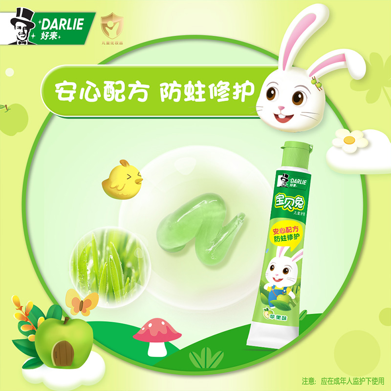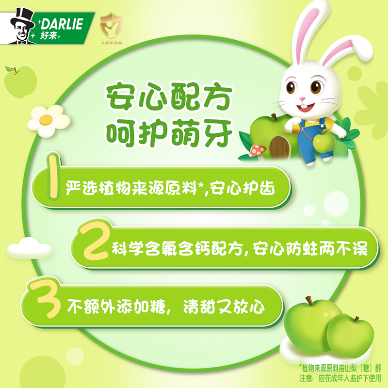 黑人(DARLIE)这款儿童牙膏,采用食品级原料制成,不添加糖,不会导致蛀牙,温和不刺激。香调清新自然,易于接受。使用过程低泡沫,深入全面清洁牙齿。包装外观附有可爱兔子卡通图案,萌趣可爱,增添刷牙乐趣。