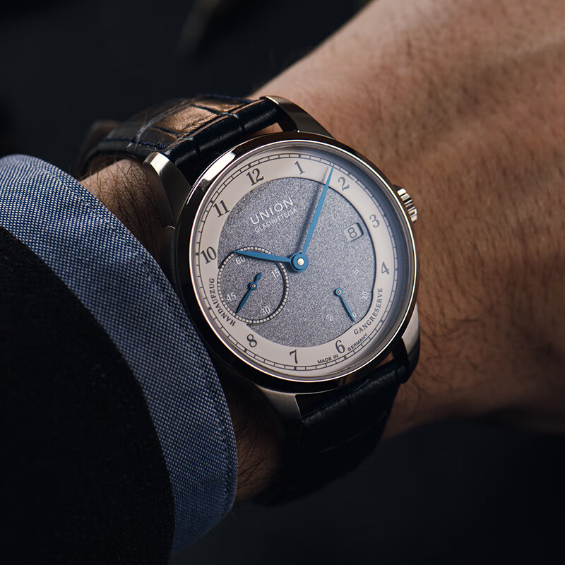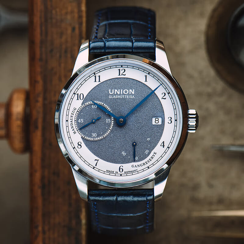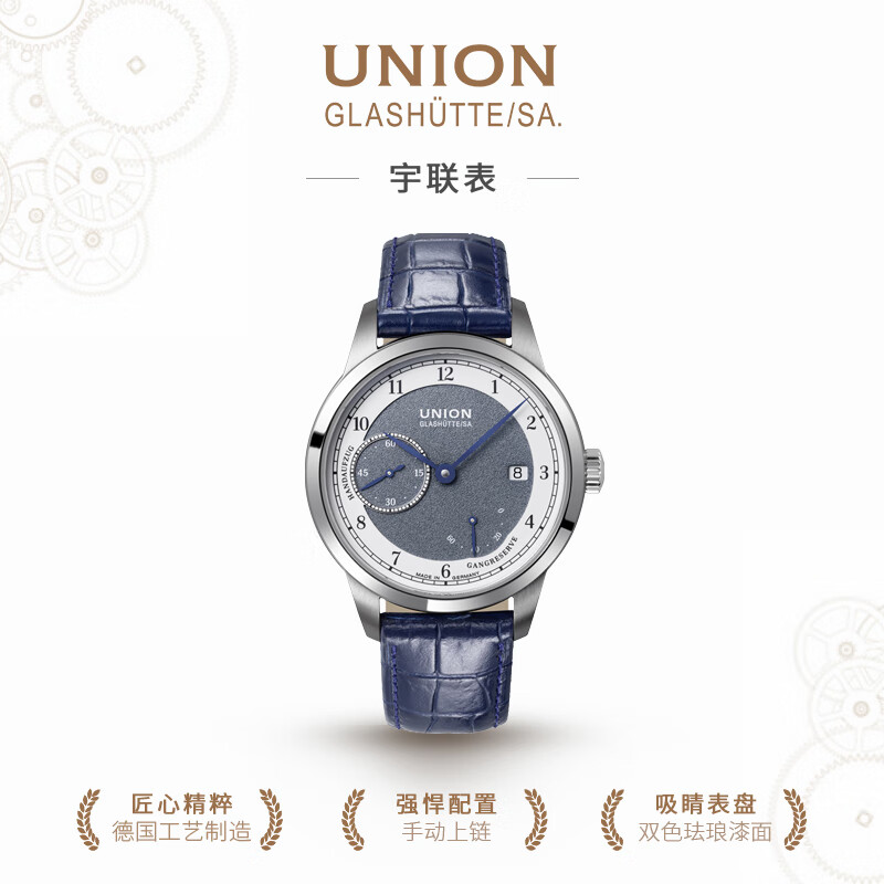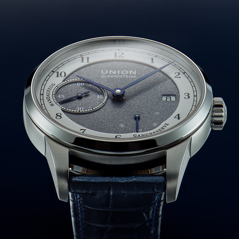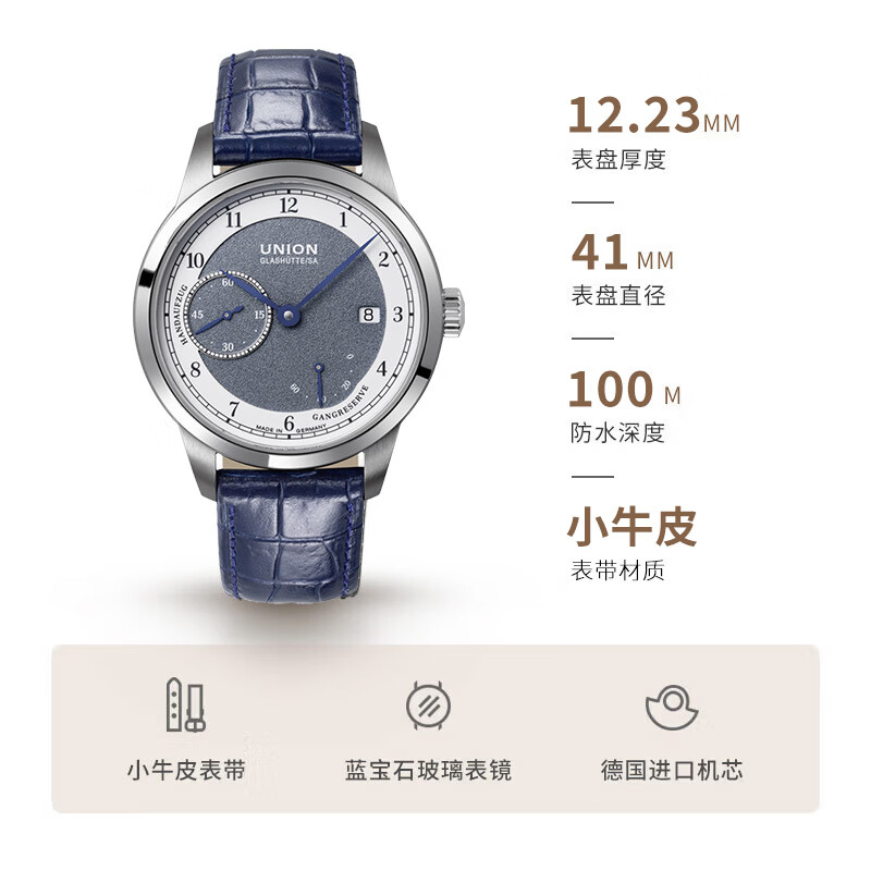 此款产品为UNION GLASHÜTTE 格拉苏蒂宇联 德国1893系列 男士手动上链腕表 D007.456.16.082.00,1893约翰内斯·德尔施泰因版日历腕表,珐琅涂层表盘质感不凡,经典德式制表典范。表盘厚度12.23毫米,100米防水深度,弧面蓝宝石玻璃表镜,抗刮耐腐蚀硬度仅次于钻石塑造美妙的立体视觉。蓝色小牛皮表带,结实耐磨贴合手腕质感舒适轻奢儒雅。