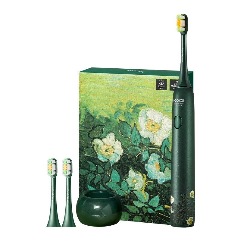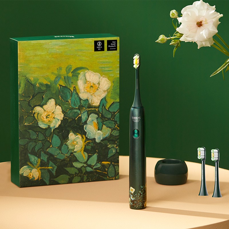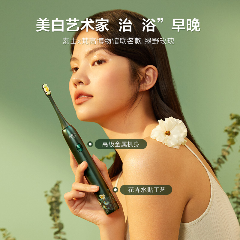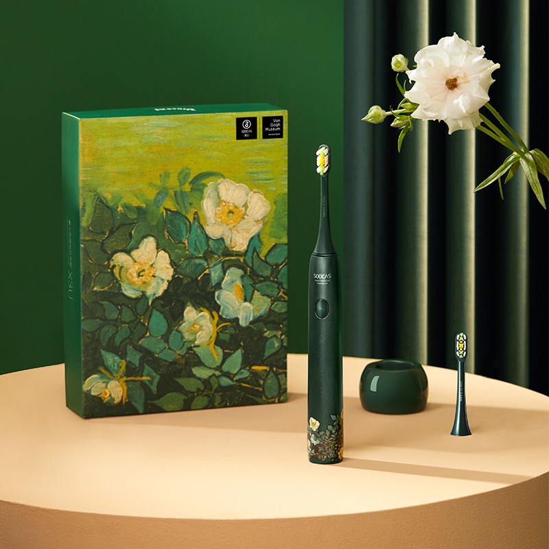 素士(SOOCAS)这款X3U电动牙刷(梵高绿野玫瑰礼盒款),具有39600次/震频,配备无铜防锈刷头*1(无需担心刷头生锈滋生细菌)、深度抛光刷头*1、敏感软毛刷头*1,支持清洁模式、敏感模式、新手模式、抛光模式,采用Type-C充电接口,一次充满可用30天,IPX7级防水。