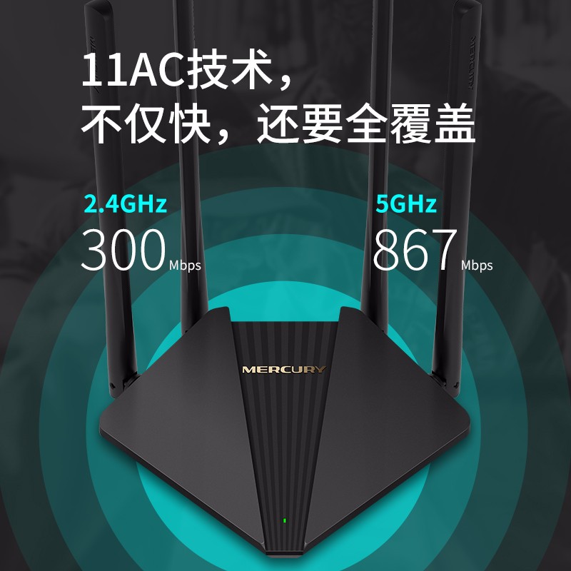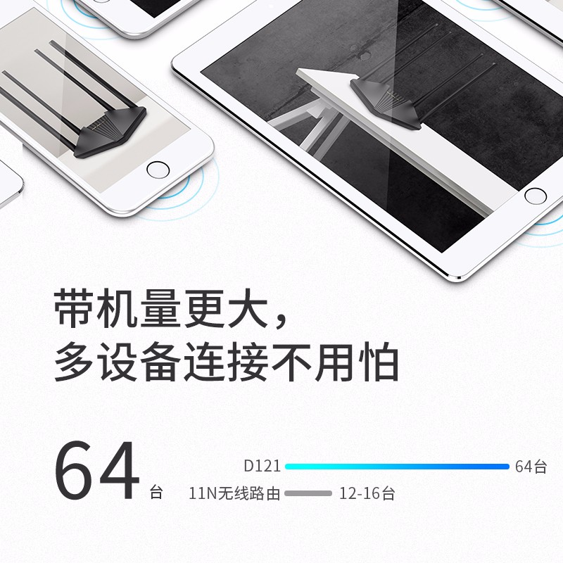 D121采用先进11AC技术,在2.4GHz频段和5GHz频段,无线速率分别高达300Mbps和867Mbps。2.4GHz频段,解决穿墙难题,轻松实现i-ⅰ全屋覆盖,5GHz频段带宽更大,信道纯净干扰少,外置4根高增益全向天线,经过精密的计算专业的天线内部结构设计,让路由获得更高的天线增益;2根2.4GHz天线与2根5GHz天线科学合理布局,从而降低同频干扰,信号更强更稳定,无线覆盖范围更广,传输速度更快,具备双频合一功能,可将2.4GHz和5GHz两个频段合并为一个SSID(无线名称),同时通过802.11kV协议实现Wi-Fi信号无缝漫游,智能为手机等终端选择信号更优、速度更快的频段,在终端移动过程中,自动切换频段,让你始终保持高网速体验。