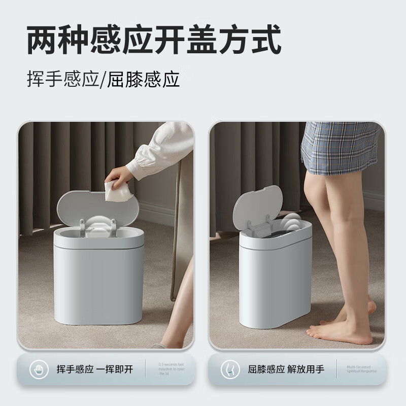 5CM宽跑道型设计,轻松置于夹缝之中。IPX5级智能防水,告别触控失灵,卫生间、浴室溅水潮湿环境应对自如。三种模式智能开盖,随心开启懒人模式,智能感应轻松捕捉你的每个动作。挥手感应,一挥即开,轻松省心。屈膝感应,灵敏感知,无需弯腰。一键常开,无动力常开,频丢垃圾更方便。