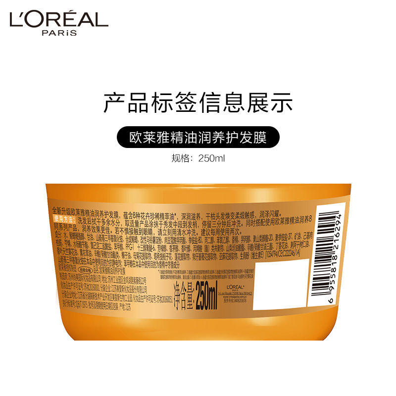 L'OREAL PARIS巴黎欧莱雅精油润养护发膜,富含摩洛哥坚果精油与亚麻荠油,从根部开始,养出秀发繁叶般的新生命。浓稠不油腻乳霜质地,富含精纯珍贵摩洛哥和亚麻荠油,深透三重润养发根、发丝、发梢,令发丝绒柔、莹润、滋养,感受秀发的神奇蜕变。
