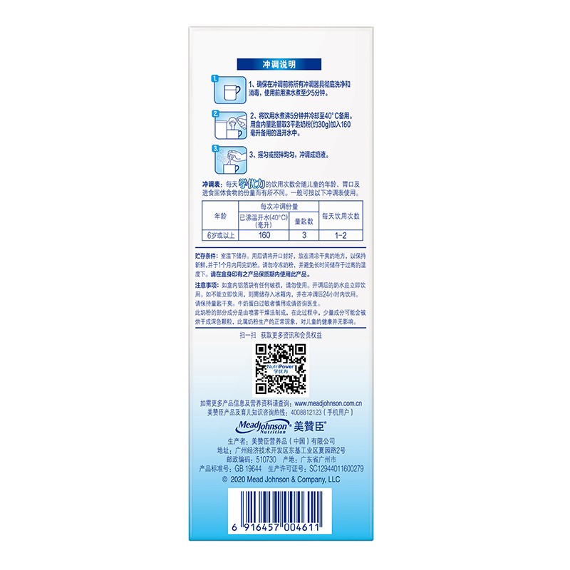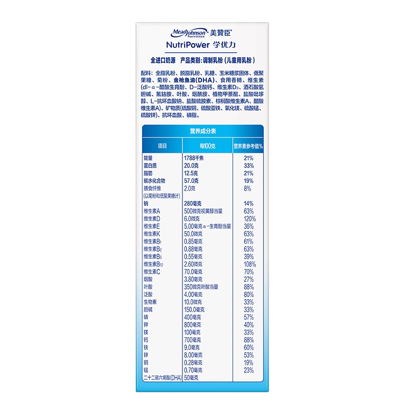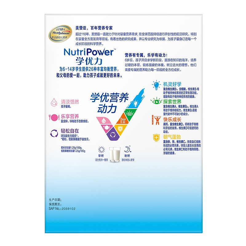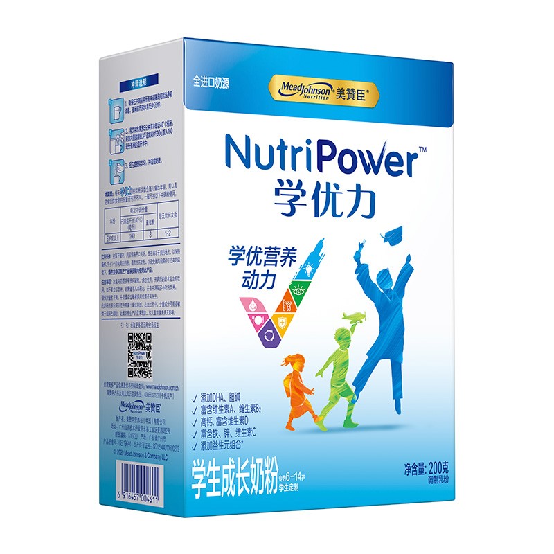 美赞臣(MeadJohnson)学优力学生奶粉,是美赞成汇集国际团队专为6-14岁的学生量身定制的学生奶粉;现在的孩子们学习时间越来越长,学习难度越来越大,孩子们的压力也越来越大,特别是6-14岁这个年龄段的孩子是身高增长飞速的阶段,身高增长在40-60cm,需要每天摄入足够的营养才行;加上这个年龄段孩子的学业负担重,学习压力大,如果饮食不规律,会大大降低孩子的学习能力,导致学习下降,生长迟缓。美赞臣(MeadJohnson)学优力学生奶粉富含钙、铁、锌、维生素C、维生素A、DHA、胆碱等,能够促进孩子的生长发育,促进大脑发育,帮助长高和提高智力;另外还添加了天然菊芬+FOS益生元组合,帮助维护孩子的肠道健康。