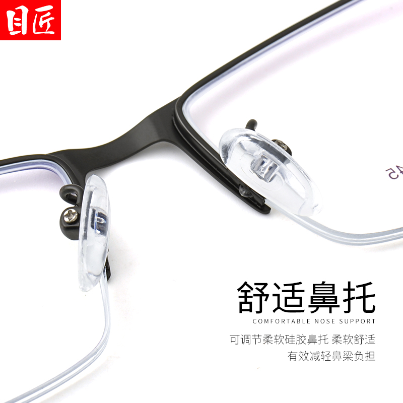 该款目匠5206超轻合金半框光学镜架,采用合金材料打造,镜腿则采用TR90,佩戴起来超轻不夹脸,对鼻梁耳朵无负担,产品分为大小码两个尺寸。
