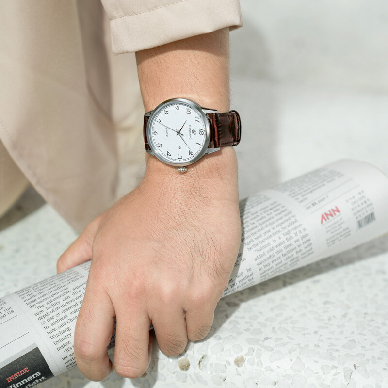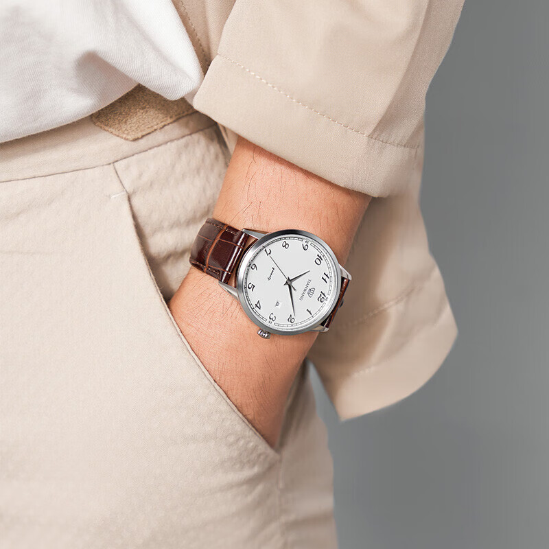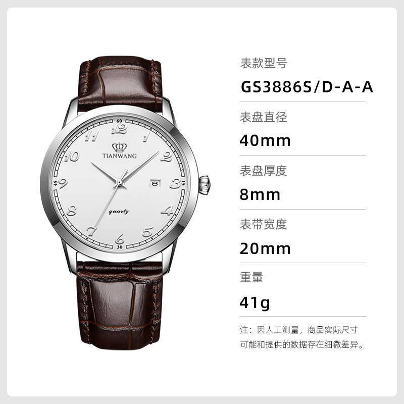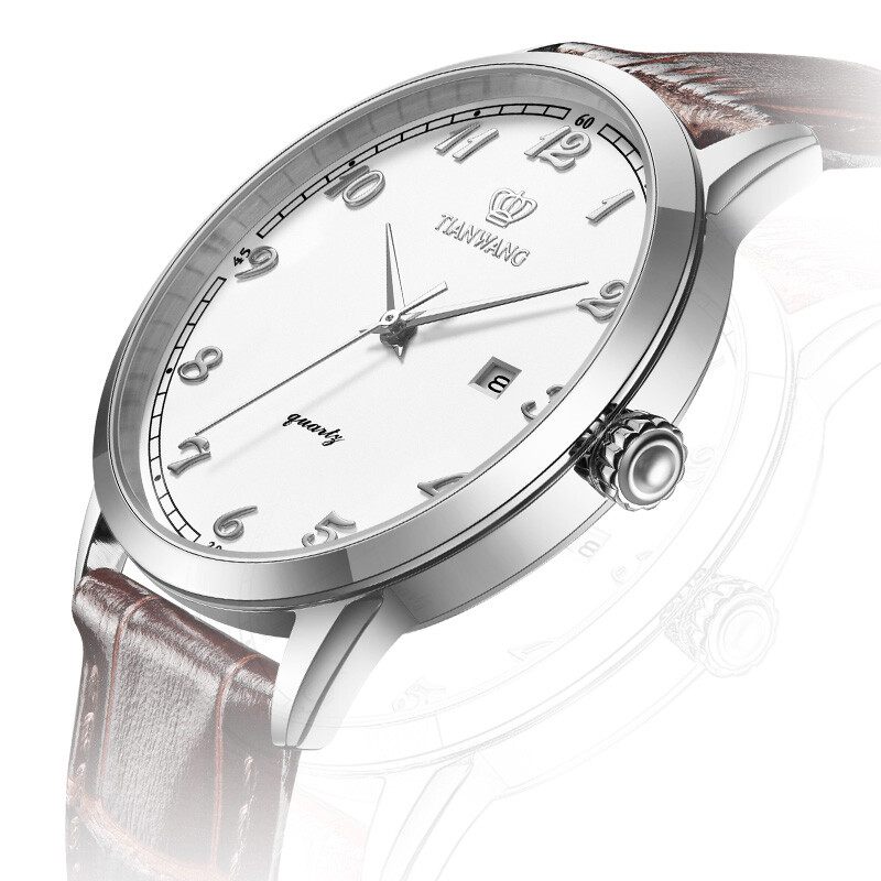 天王(TIAN WANG)推出的这款41毫米腕表,搭载石英机芯,走时稳定。具有30米防水性能,满足日常防水需求。采用矿物强化水晶玻璃表镜,耐磨损且通透性好,读时清晰。圆形表盘配有阿拉伯数字刻度、太妃指针,时尚简约。