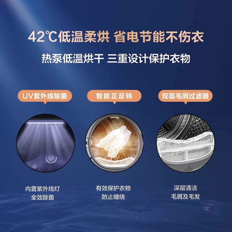 小天鹅TH100-H32Y 热泵式干衣机,10kg容量,19年上市,银色外观针对不同面料设计有16种烘干程序,自带烘干支架等附件。采用热泵低温烘干技术,热量循环使用,低至42℃恒温低温烘干衣服,护色护衣。置顶紫外线灯,利用不锈钢干衣筒镜面反射达到除螨除菌的效果。另有一键烘干功能,20分钟快速烘干,热风暖衣,冬季不穿冷衣,雨季不穿湿衣。170°广角开门,LED触控面板,产品尺寸为595*615*845mm,净重48公斤,噪音69dB。