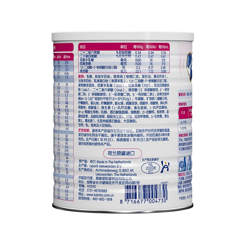 Kabrita佳贝艾特属于海普诺凯乳业集团,旗下主要的产品有新鲜羊奶、羊酸奶、羊乳酪、婴幼儿配方羊奶粉、妈妈羊奶粉,是较早推出婴幼儿羊奶粉的品牌。这款奶粉益生菌+益生元,富含膳食纤维,呵护肠道健康,好消化,好吸收,纯羊乳蛋白,荷兰原装进口,含有丰富的蛋白质,多种脂肪酸,维生素,矿物质。
