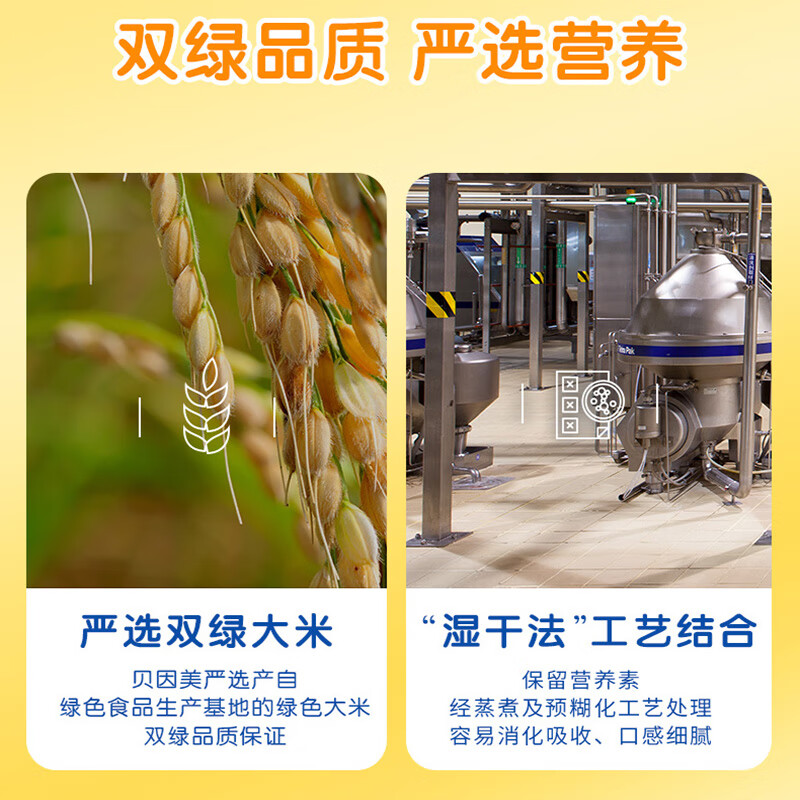 贝因美于1992年11月成立,公司以“亲子顾问,育儿专家”为品牌定位,始终坚持将提升产品品质作为保持企业可持续发展的核心优势,建立、实施和不断完善生产质量管理体系,应用生产工艺与专业设备。主打产品包括婴儿奶粉、婴儿米粉、饼干、溶豆和面条等。这款BEINGMATE 贝因美 婴幼儿营养米粉优选进口优质奶源,层层把关,品质安全保障,精选绿色大米原料,经过多重加工制作而成。不添加香精、色素和防腐剂,保护宝宝娇嫩肠胃;贴心的独立小袋分装设计,更方便冲泡和携带,安全又卫生。