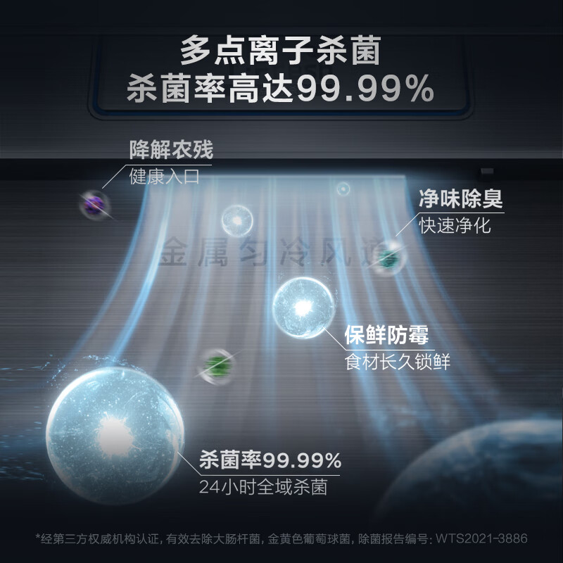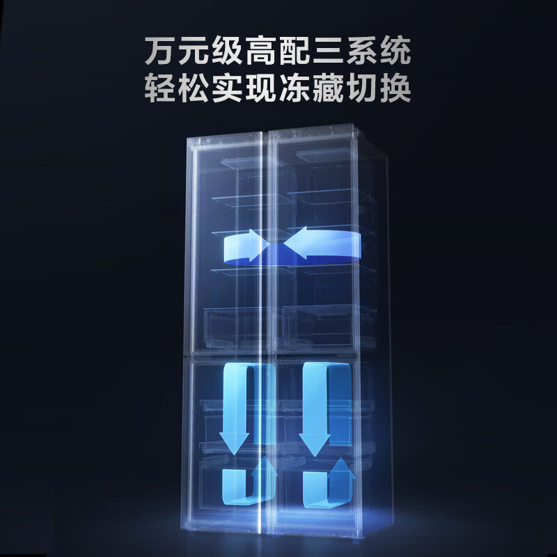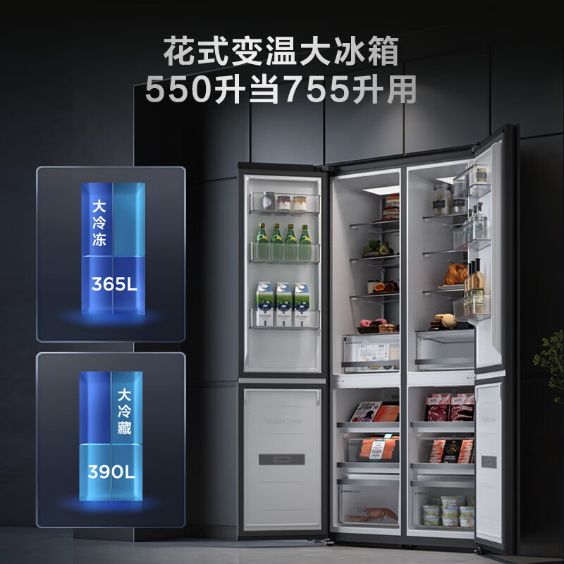 TCL 格物系列 R550Q10-S 风冷对开门冰箱,总容量为550L,其中冷藏室185L,冷冻室160L,两个宽幅变温空间总容量为205L,可以从-18~5℃变温,灵活补充冷冻或冷藏空间,最大冷冻空间可达365L,最大冷藏空间可达390L,并可以单独开关。搭载变频压缩机+变频风机,综合耗电量为1.05kwh,符合一级能效标准,冷冻能力为5kg/12h,并支持-32℃深冷锁鲜。采用独立三循环制冷系统,冷藏、冷冻、变温室各搭载1个蒸发器,避免互相串味,配合AI高灵敏度温度传感器,多点测控,控温能力更强。搭载TCL生态阻氧保湿系统,通过调湿控养膜,智能调节抽屉内湿度,降低食材氧化程度,提升保鲜时长。冷藏室还采用多点离子杀菌技术,全方位释放正负离子群,浓度是普通冰箱5倍,实现99.99%的除菌率。