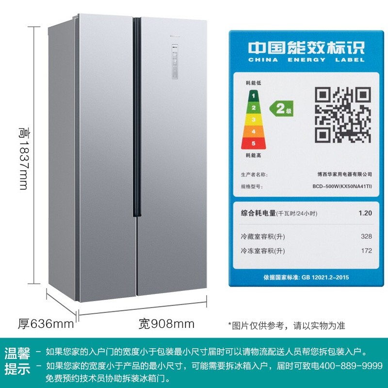 SIEMENS 西门子 BCD-500W(KX50NA41TI) 500升 变频风冷 对开门冰箱,550MM箱体厚度,纤薄外观,风冷无霜,变频压缩机,旋转制冰盒,双风路循环,二级能效,冷藏室328L,冷冻室172L,综合耗电量1.2kwh/24H,产品尺寸908*636*1837mm。
