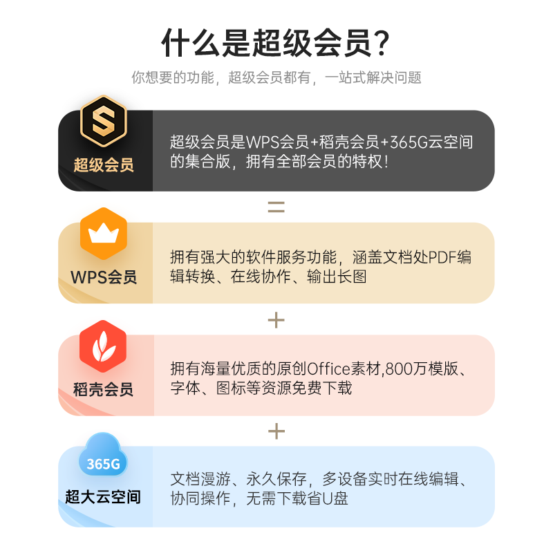 超级会员是WPS会员+稻壳会员+365G云空间的集合版,拥有全部会员的特权。拥有强大的软件服务功能,涵盖文档处理 PDF编辑转换、在线协作、输出长图等。拥有海量优质的原创Office素材,800万+ 模板、字体、图标等资源免费下载。文档漫游、永久保存,多设备实时在线编辑、协同操作,无需下载。