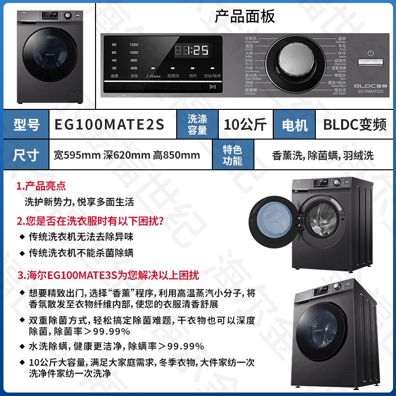 海尔 EG100MATE2S 滚筒洗衣机 搭载BLDC变频电机,性能强劲,同时省电静音,噪音低至52dB,拥有1.08的高洗净比,一级能效更加省电。免水洗除菌,有效杀灭纤维深处细菌,除菌率高达99.99%。巴氏温护除菌系统,持续升温至60℃深层除螨,有效呵护衣物。专利双喷淋,随漂随冲,减少泡沫残留;90℃高温筒自洁,减少内外筒间藏污纳垢,避免衣物二次污染。特有新衣洗程序,利用30℃轻柔水流穿透纤维,轻松去除浮沉和异味。产品深(含门)宽高为:650mm*595mm*850