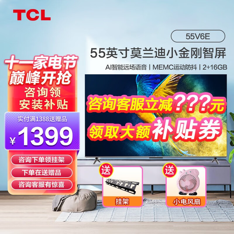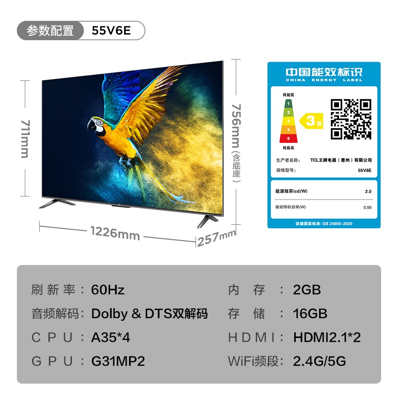 55V6E液晶电视采用大气的莫兰迪灰色边框,材质为航空级金属,寿命长,散热快,保证电视长期使用的稳定性。内存配置为2GB+16GB。支持2.4G和5G双频段无线网。屏幕带有莱茵TUV低蓝光认证,不易引起眼睛疲劳。支持Q画质引擎,色彩、亮度、对比度和清晰度均有所提升。支持Conchs Sound音箱,杜比、DTS双解码,可调节个频段声音,视听感受更佳。AI声控功能可支持四川话、河南话等六种方言识别。带有两个HDMI2.1接口,两个USB接口。