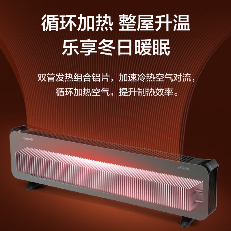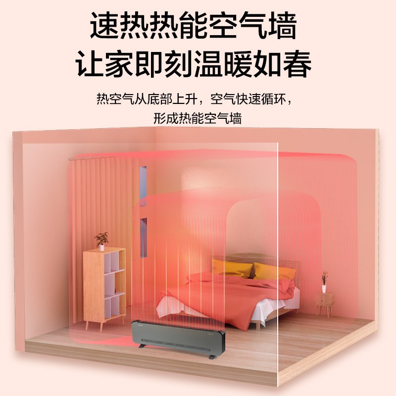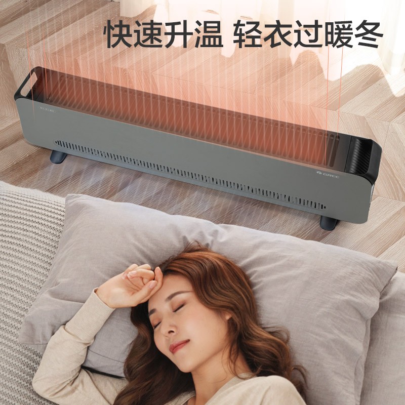 格力踢脚线取暖器,2200W大功率,3秒速热,2档调温,四级防水,斜向导热,热量集中暖意十足,小体积大热量,节省空间,易收纳,热幕效应。