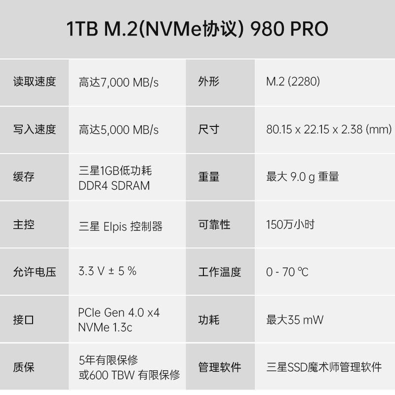 三星980 PRO采用三星V-NAND 3-bit MLC闪存,搭载了三星专为PCle4.0 SSD定制的Elpis控制器,对速度进行了优化,其读取速度高达7000MB/s,比PCle 3.0 SSD快2倍,写入读速也达到了5000MB/s。为确保稳定的性能,980 PRO采用镀镍涂层以提高控制器的散热效率,同时使用散热标签实现对NAND芯片的有效散热控制。保修方面,980 PRO支持5年有限保修或600TBW有限保修。