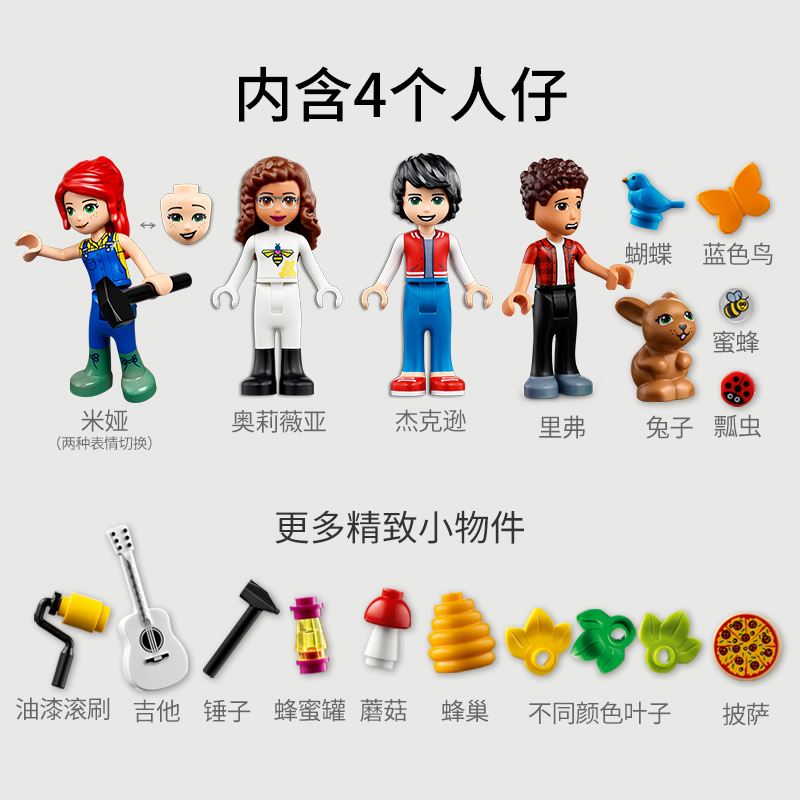 这款套装包含许多复杂的细节,能够启发各式各样的创意玩法。孩子们可以从蜂巢中收集蜂蜜,使用木工工具制作鸟箱,转动风力发电机以升起电梯,或者在巨型滑梯和秋千上玩耍。这里还有许多可供探索的隐藏细节。为了庆祝乐高好朋友系列推出十周年,这款套装提供了一个二维码,透露了隐藏在心湖城内的宝藏。