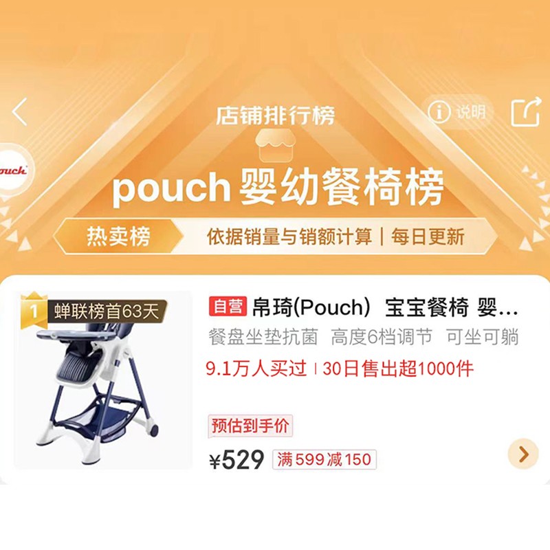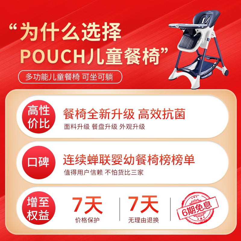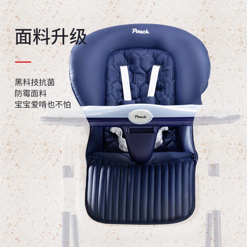 Pouch 帛琦 欧式婴幼儿可折叠餐椅面料升级,黑科技抗菌、防霉布料,宝宝爱啃也不怕,食品级抗菌餐盘,宝宝吃玩随心所欲,采用欧洲沙发绣花工艺,提升宝宝舒适感。