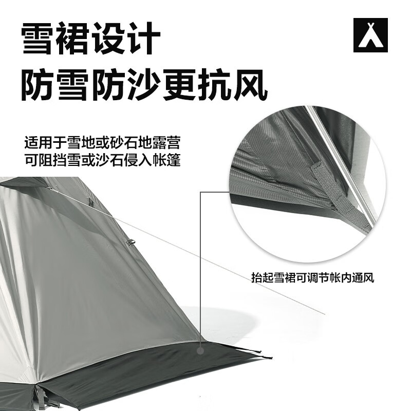 MOBI GARDEN 牧高笛 冷山 plus 三人四季帐篷适合雪地或砂石地域露营,雪裙设计可以阻挡地上的雪或砂石侵入帐篷,亦可以抬起雪裙调节帐内通风,外帐面料防水系数达2000mm,能低于大暴雨级别,专业风洞测试,配合地钉加牢,可抵抗7级大风,7001航空铝架的加持下,支架重量大大减轻,前后开门创造双侧进出空间,大大增强使用便捷性。