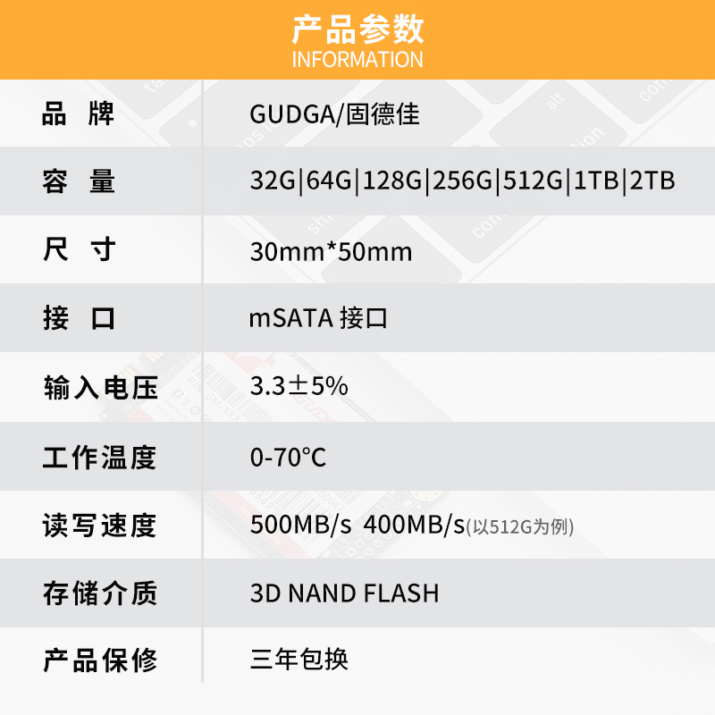 固德佳(GUDGA)这款固态硬盘,选用3D NAND Flash存储介质,相对于采用2D NAND Flash的硬盘,容量更大、价格更低、读写速度更快。采用芯片储存模式,无机械运行部件,运行噪音低。产品尺寸为:30mm*50mm,小巧轻薄,适应多种设备应用环境。这款固态硬盘容量有32GB、64GB、128GB、256GB、512GB、1TB、2TB七种可选。