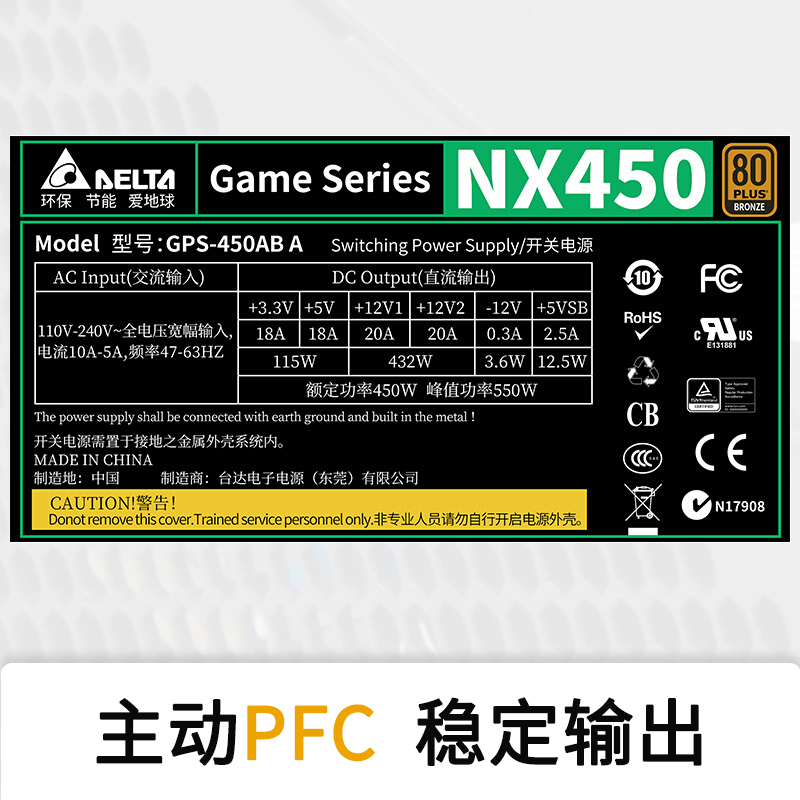 DELTA台达是知名的电源代工厂商,这款Gaming Series NX450台式机电源使用主动式PFC技术,通过了全球80Plus铜牌认证,在230V电压,50%典型负载下效率达到88%。额定功率450W,峰值功率550W,12cm静音温控风扇,磨砂外壳,三年质保。