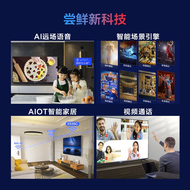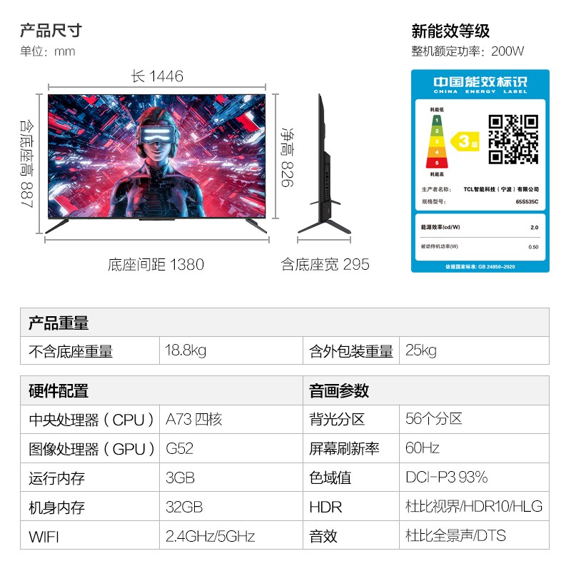 FFALCON 雷鸟 55S535C 4K液晶电视 55英寸,全面屏设计,全金属拉丝工艺,棋盘式背光,分区域独立控制,93%DCI-P3高色域,D65原彩色温,MEMC动态补偿,支持杜比视界、全生态HDR、杜比全景声。AI远场语音,MTK9652高性能芯片,四核A73+四核G52,3+32GB大内存,支持2.5/5GHz双频WiFi。
