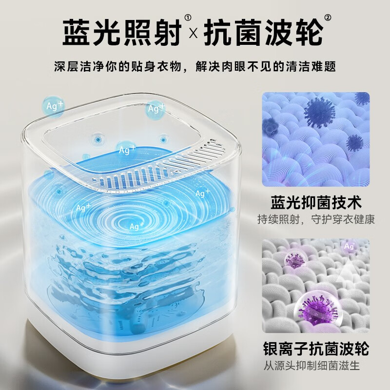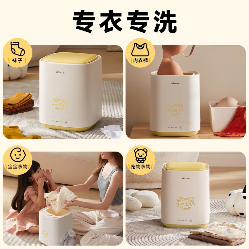 小熊 XYJ-A05V1 定频迷你洗衣机,4.5公斤容量。非常适合洗贴身衣物。内置正反转波轮,有效去污。支持蓝光除菌。可折叠方便收纳。净重1.8公斤,额定功率10w。