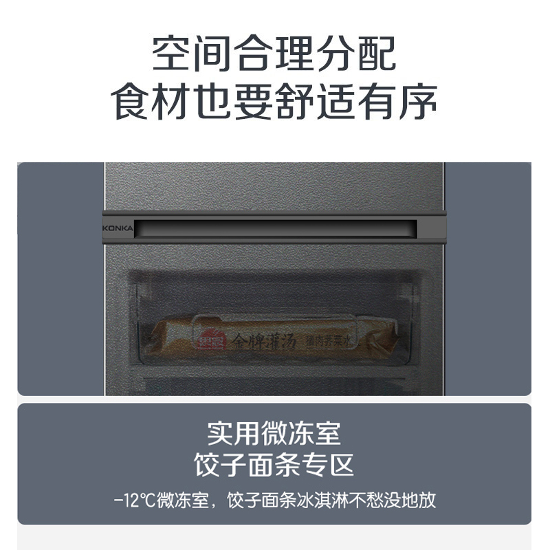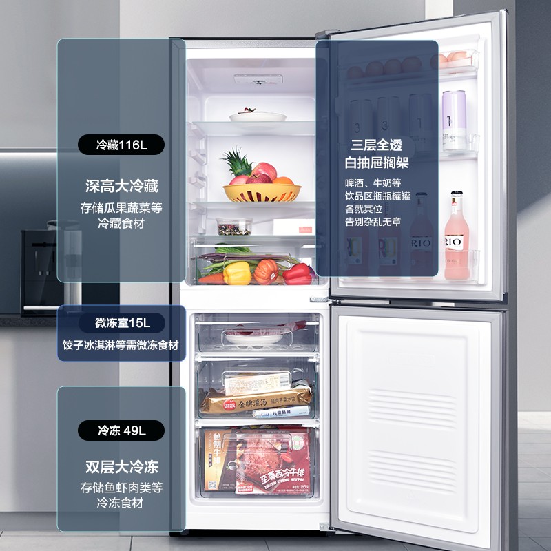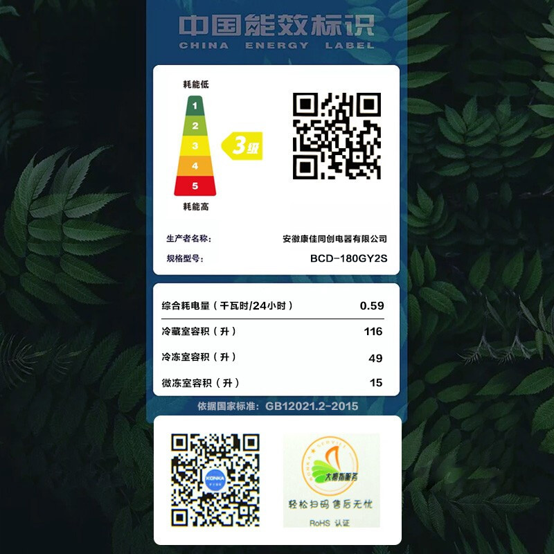KONKA 康佳 BCD-180GY2S 双门冰箱,采用直冷定频设计,总容积180升,其中冷冻室71升,冷藏室109升。大冷藏室设计,能够容纳更多蔬果饮料等,内部钢化玻璃隔板多层次可灵活调节空间。3级能效,从网友评论来看除了冷藏空间较大外,运行时也比较安静。外形尺寸510*548*1512毫米。