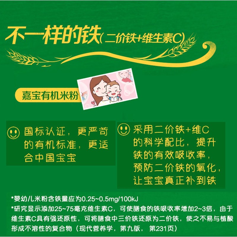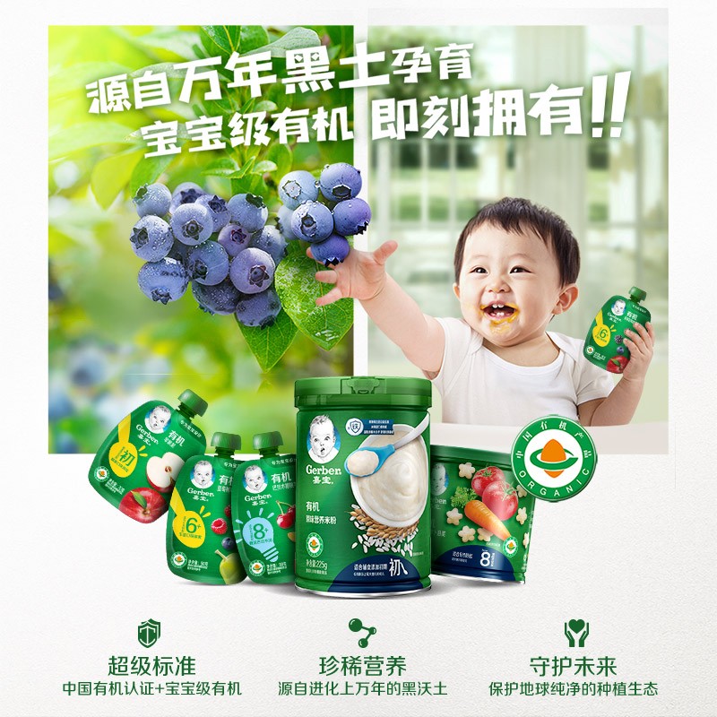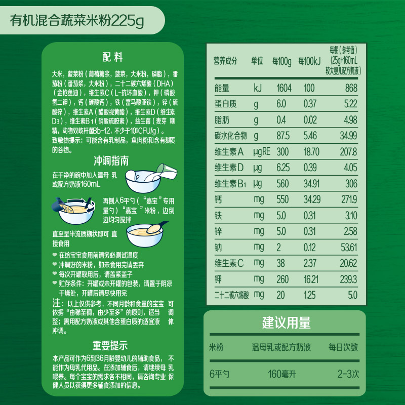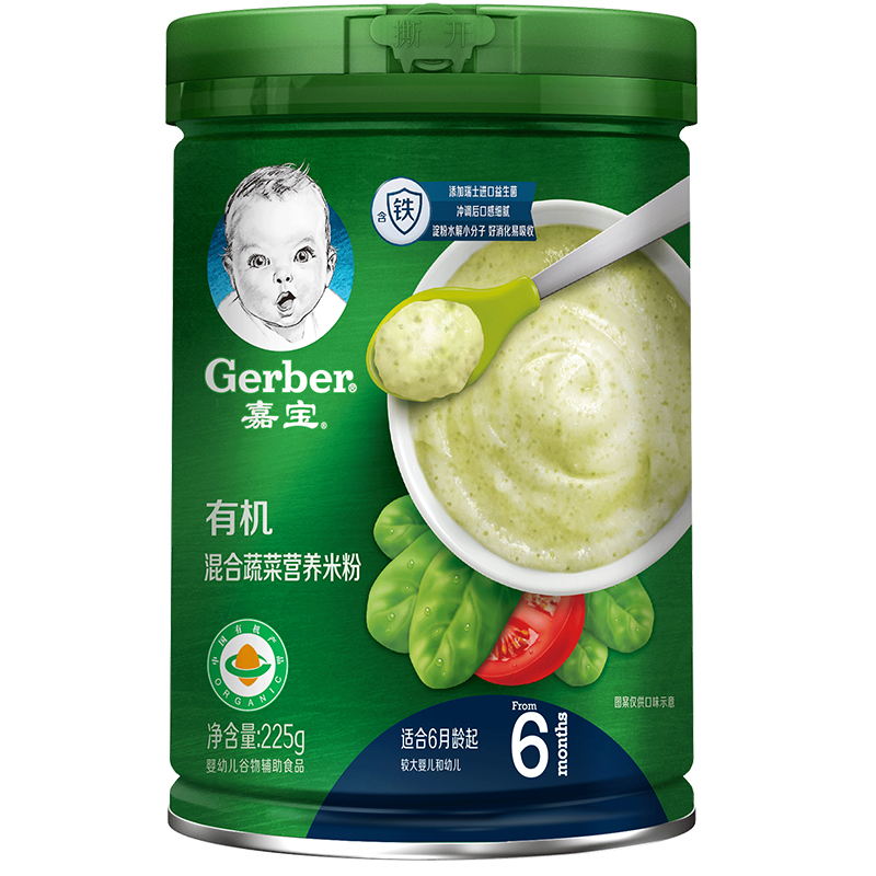 这款嘉宝有机混合蔬菜米粉 ,适合6-36个月的宝宝食用。添加了多种蔬菜和水果混合而成。富含易吸收的二价铁,可快速补铁。含有瑞士进口益生菌Bb-12,搭配CHE定粉水解工艺,帮助吸收。口感细腻,营养丰富,能满足孩子2段的需求。