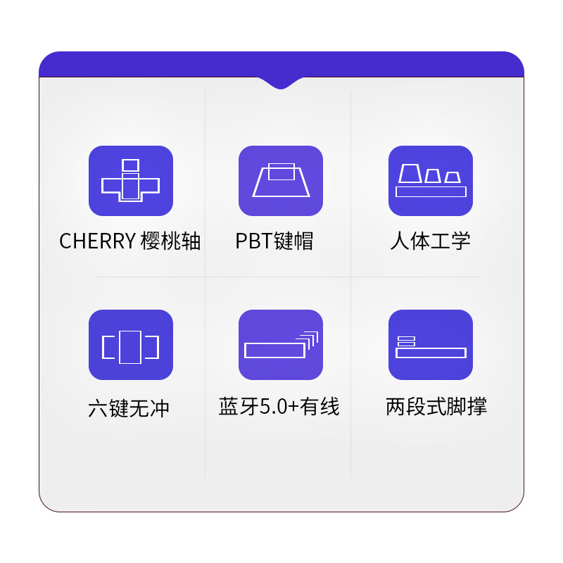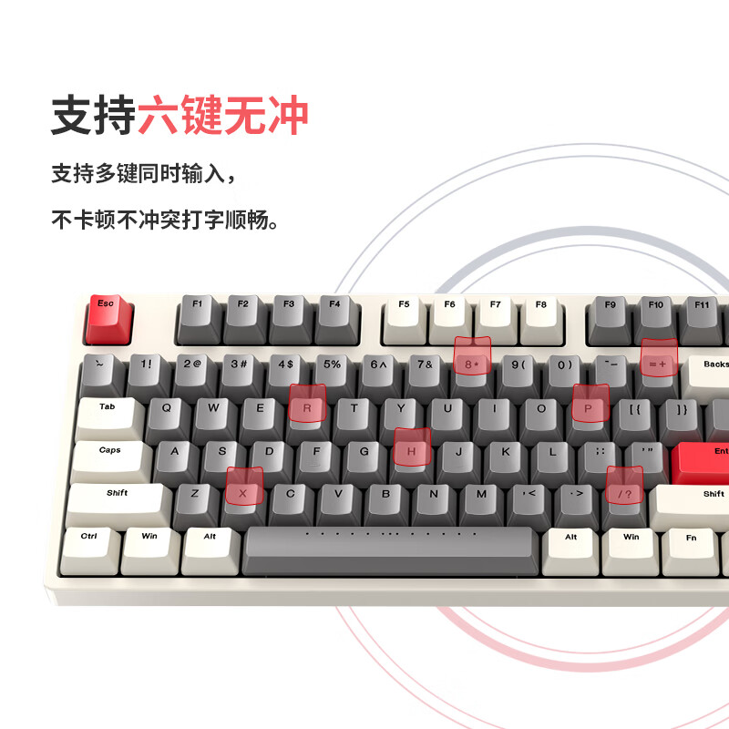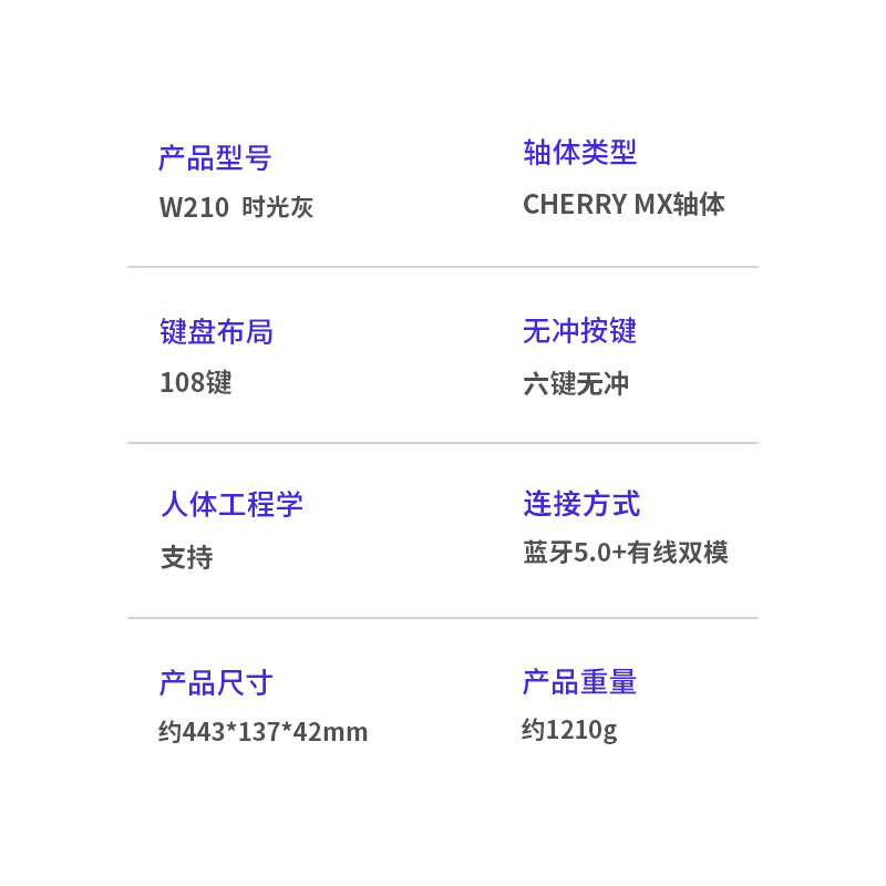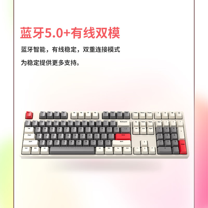 iKBC这款双模机械键盘,精选PBT键帽,充分发挥PBT材质特点,干燥舒适不易打油。搭载CHERRY MX开关,每一颗开关均产自德国奥尔巴赫CHERRY工厂,内置强力弹簧提供约5000万次敲击寿命。支持任意6键无冲,在键盘同时最多按下6个按键能被精准识别,不会造成系统混乱。两段式脚架设计符合人体工程学,可根据需要调节倾斜弧度。智能调节使用与待机场景,优化输入体验,2节7号电池在以每月172小时的工作时长下,续航时间达6个月。
