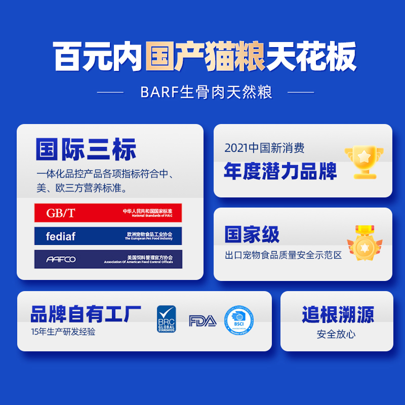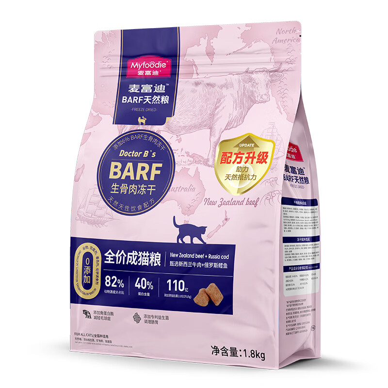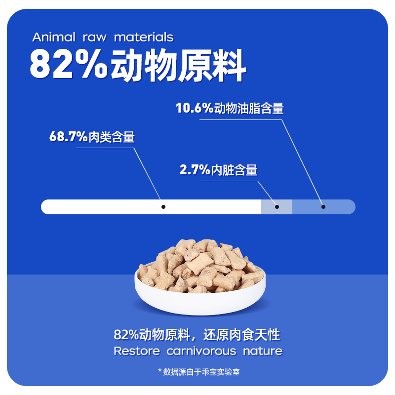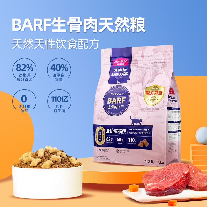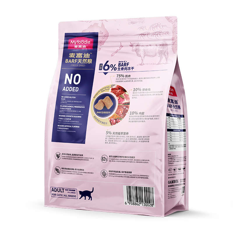 BARF生骨肉天然粮,给予猫咪新的营养摄入尝试,适合1岁以上猫咪食用。粗蛋白含量大于40%,粗脂肪含量大于16%。猫粮中含有6%以上的BARF生骨肉冻干添加,区别于常规单一的肉冻干,BARF生骨肉冻干是按照75%的动物肌肉、10%的带骨肉,10%的带血内脏,5%的天然果蔬营养,以75:10:10:5的科学搭配方式均衡搭配而成,这也很符合BARF饮食的推荐搭配准则。动物原料占比82%以上,猫咪一口下去满满的含肉量,获得极大的满足感。