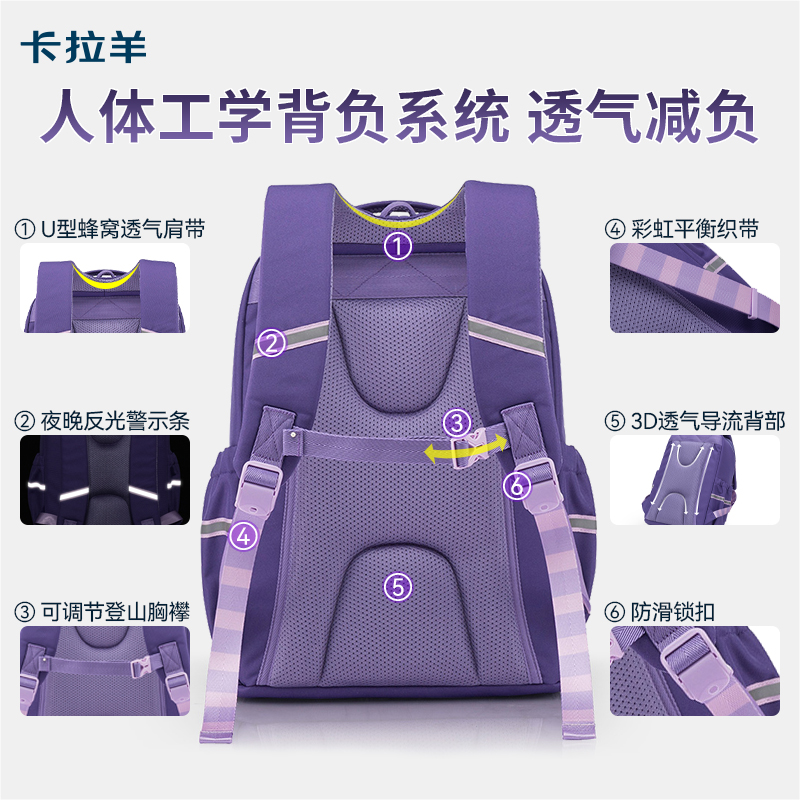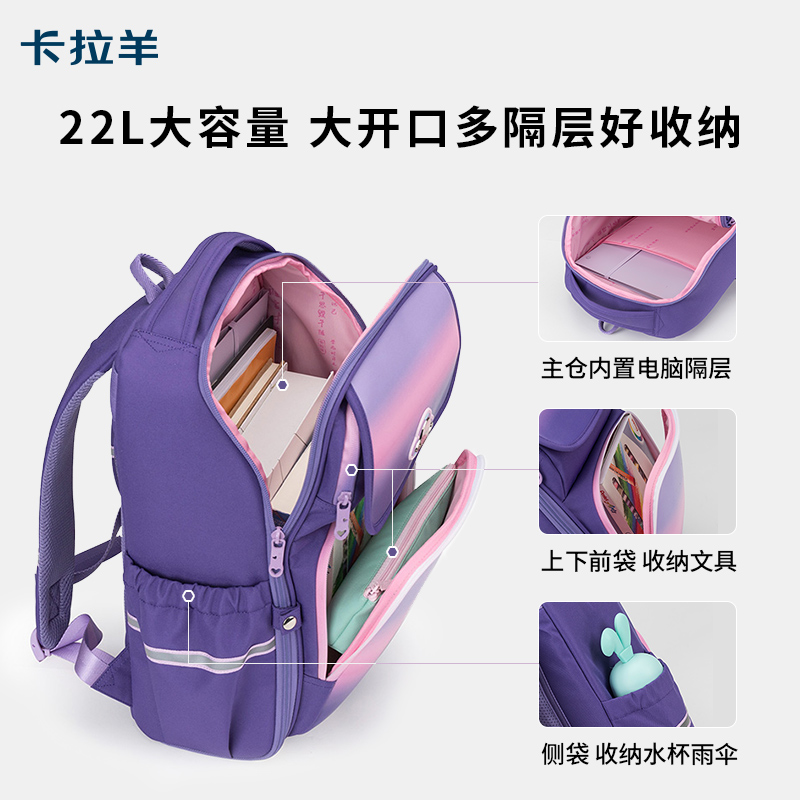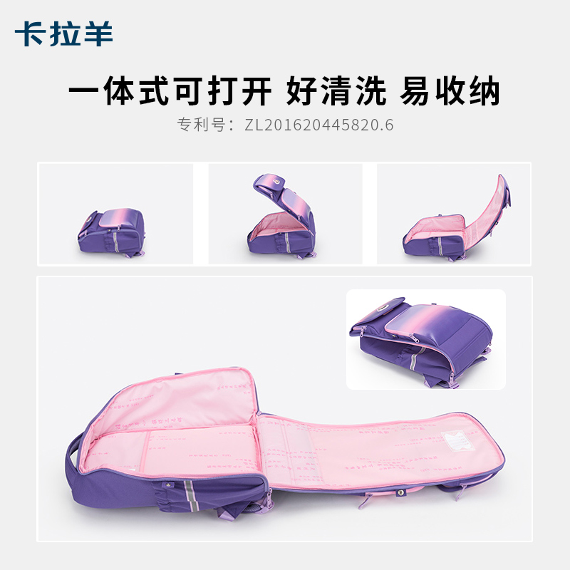 Carany 卡拉羊 超光速系列 儿童双肩背包 CX5116,包型采用一体式结构,由一根拉链贯穿整个书包,能打开成一片式,可以轻松清洗到每个边角部位,实现全方位消毒,轻松帮您定期为孩子的书包做一次深度清洁。