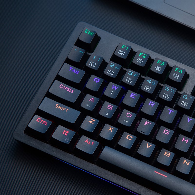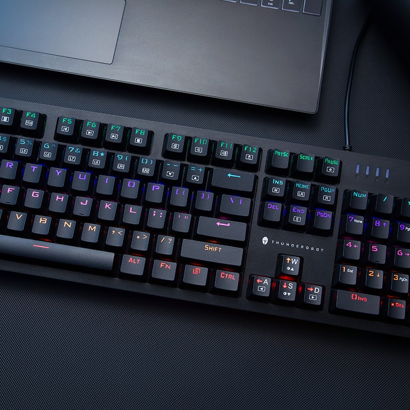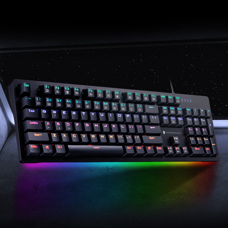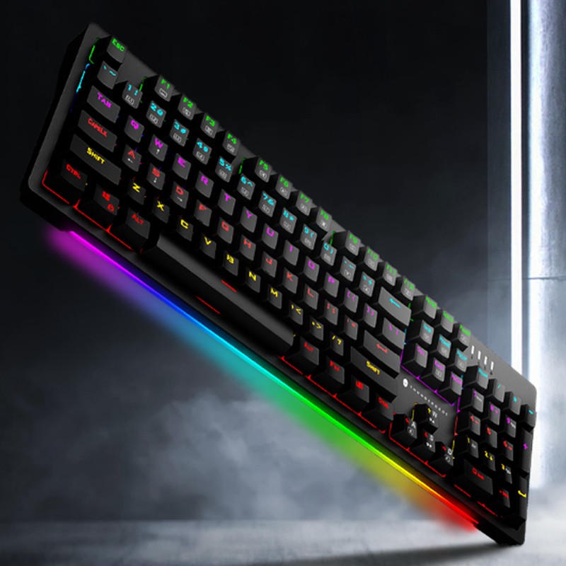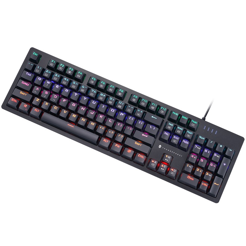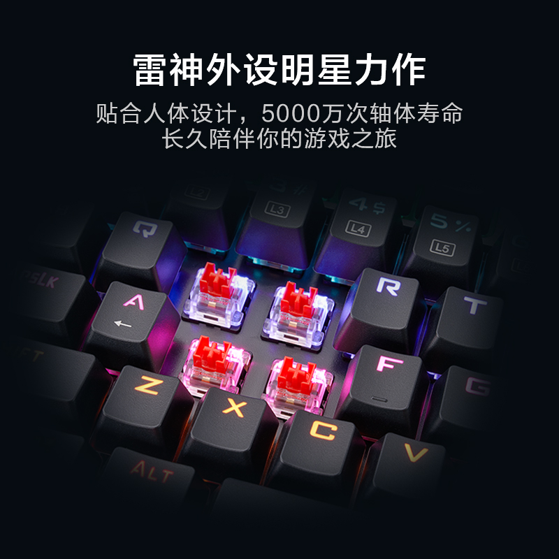 雷神 KG3104C 键盘外观上,前置一体式超长炫彩灯带,支持定制 8 种预设游戏灯效+9 种幻彩灯效,满足不同的场景体验;采用下沉式结构设计,贴合手感,兼具高品质与稳定手感;键盘采用雷神 TR 轴,拥有沉浸式敲击体验,拥有双色透光键帽,防汗水侵蚀、耐磨。拥有12种多媒体快捷键,随心操控,支持定义宏按键。