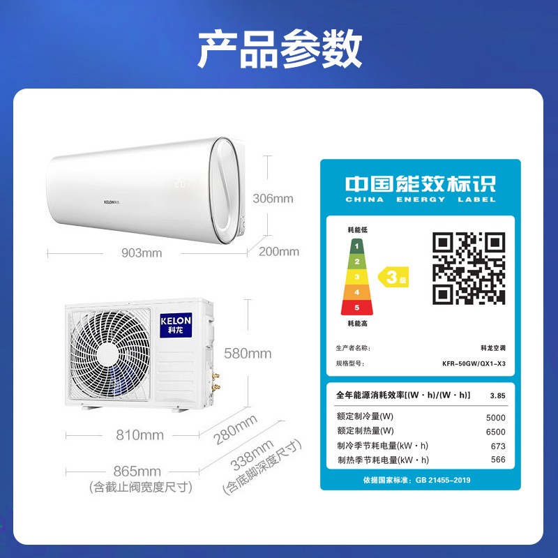 KELON 科龙 KFR-50GW/QX1-X3 壁挂式空调 2匹 。提前锁定舒适温度,智能直连WiFi 掌控美好生活。57℃高温烘干自清洁 吹出干净风。纳米银离子抑菌翅片 持久抑制大肠杆菌、金黄色葡萄球菌等致病菌。智能检测化霜,有效保障室内 温差小,舒适省电。24小时随心内定时空调开关, 灵活贴心。