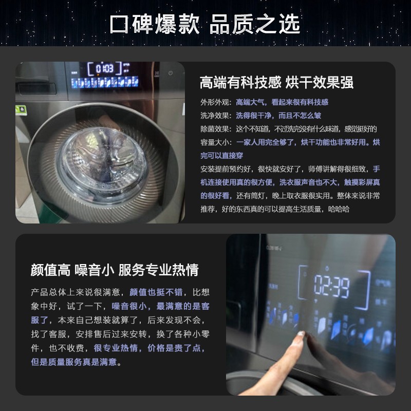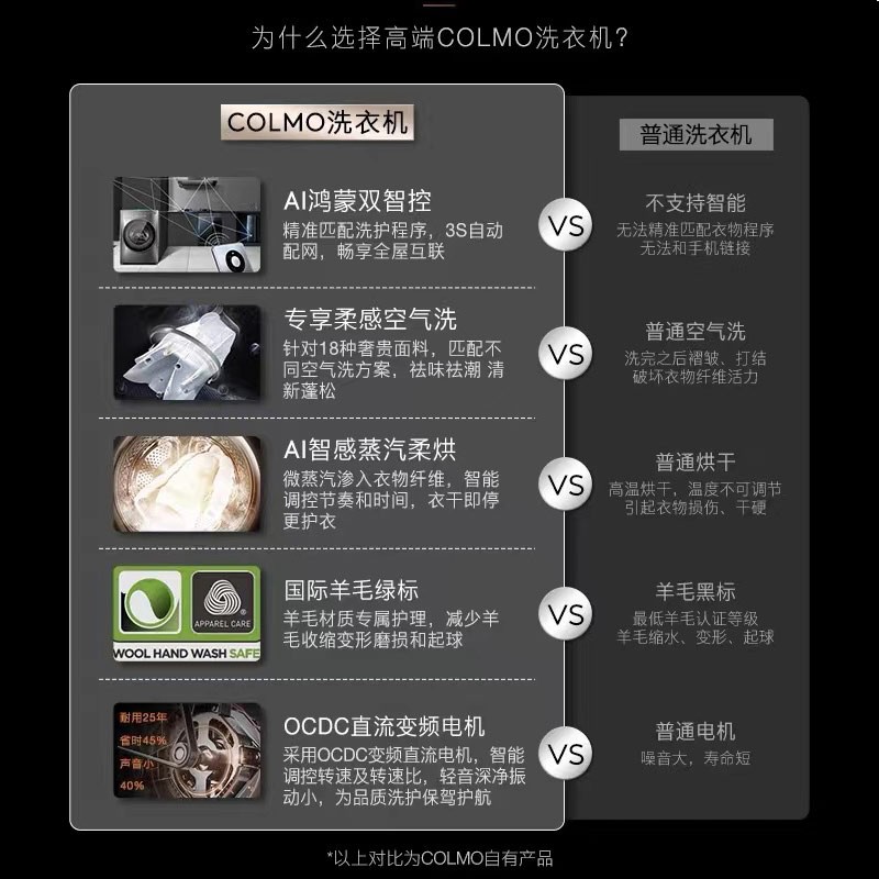 COLMO 星辰系列 CLDS10E-J 洗烘一体机搭载OCDC变频直流电机,智能调控转速和停转比,振动小噪音低,寿命长达25年。智能投放系统搭载高灵敏度重量传感器,细致感知水量和衣重,精准释放洗剂,高洗净率同时减少洗剂残留。AI智能控制冷萃银离子释放除菌,深入衣物纤维,除菌率高达99%,48小时长效抑菌。精控水流和转速,减少羊毛收缩变形和起球,通过国际羊毛绿标认证,羊毛衣物不缩水不变形,柔软如初。搭载AI感知技术,大数据识别区域特征、当地水质和天气,精准匹配洗护模式,平衡洁净和柔护力度。热活水+烫蒸汽消毒洗,60℃热水恒温洗涤30分钟,有效抑菌。AI智感精算柔烘,智能调控烘干节奏和时间,快速干衣,还支持羽绒服烘干。搭载HarmonyOS,手机碰一碰即可快速配网,支持远程控制和智能家居联动,还能进行OTA升级,洗护程序不断更新。