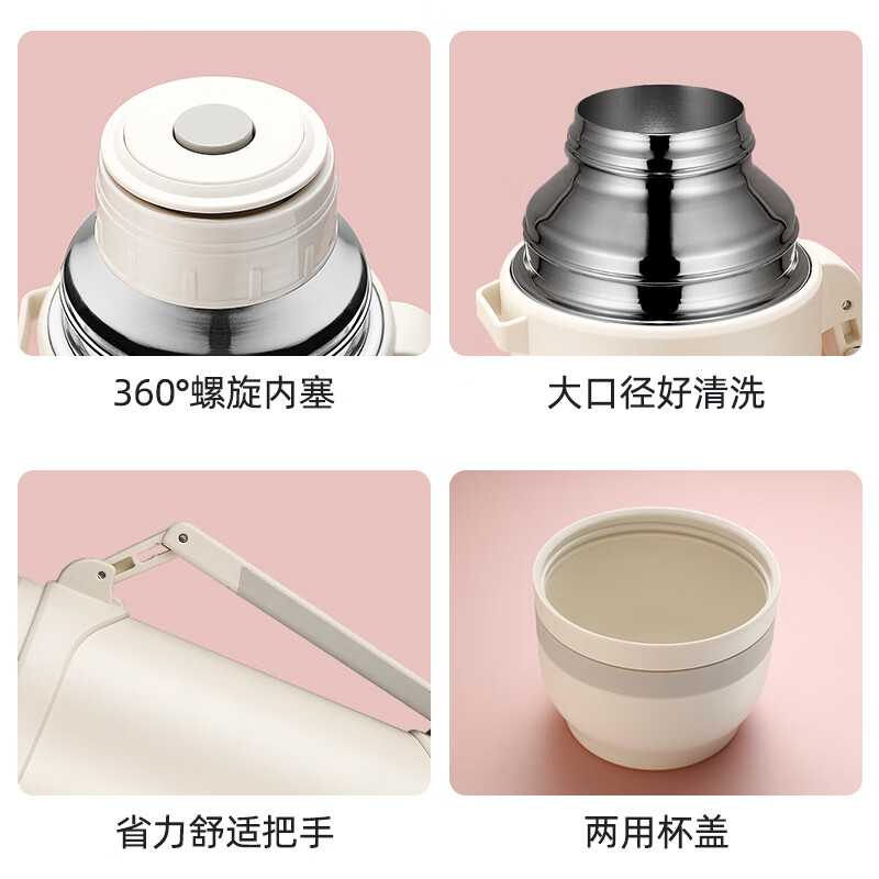 采用5层精密工艺,抽真空技术,有效降低热量传导,隔离外界温度,强劲锁温。24H保温,无惧寒暑,锁温技术,持久热能。层层创新,只为使用更放心。一键按压内塞,360。环形出水,使用安全不泼洒材质。便携尼龙绳背带,即可背肩携带也可以提宁,更加方便你的出行。
