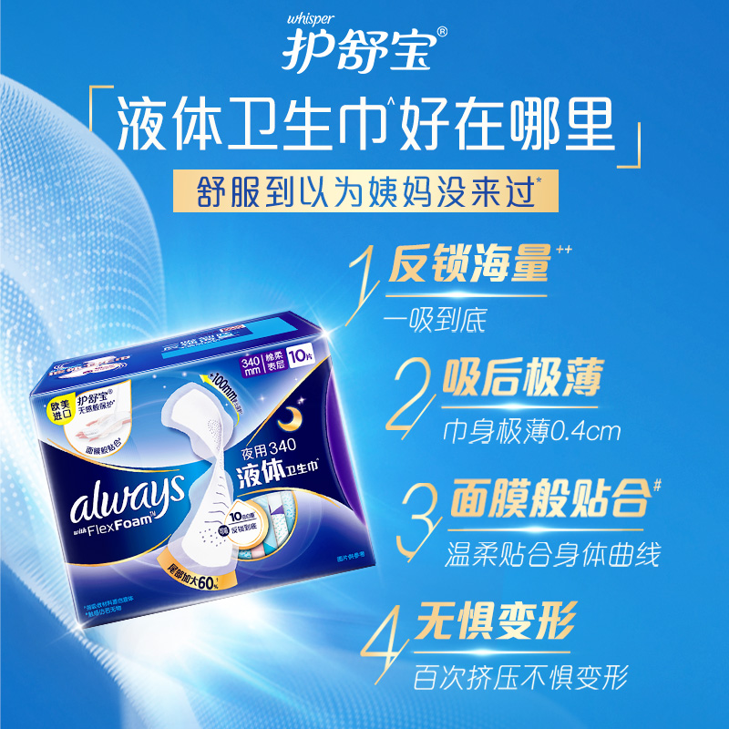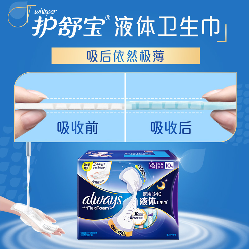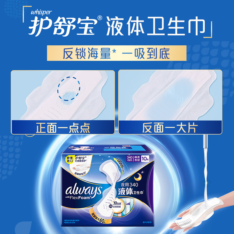 这款whisper 护舒宝 未来感·极护液体敏感肌系列液体卫生巾,采用源自液体材料FlexFoam,由水和纳米级分子聚合物通过乳化技术液化而成,贴合不同女性的身体曲线。尾部条状凹槽,帮助3D贴合,10倍吸收,柔软贴合,不惧变形,让表层干爽好洁净,吸水性也强。棉质表层保证舒适不致敏的亲肤感,减少侧漏和后漏的几率。