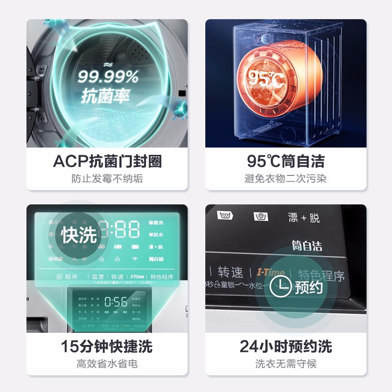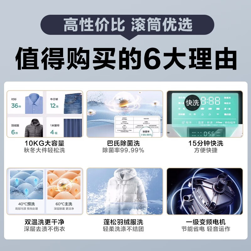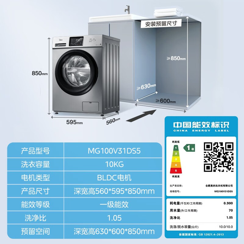 Midea美的MG100V31DS5 滚筒洗衣机,拥有10公斤洗涤容量,可满足被罩等大件的洗涤需求,搭载BLDC变频电机,脱水转速为1400转/分,达到主流水平。具有特色双温除菌洗功能,先40℃预洗,再通过60℃主洗,达到去除顽固污渍,杀灭细菌的效果。洗衣机门圈采用了抗菌材质,避免了圈垫发霉,滋生细菌,同时拥有95℃桶自洁功能,卫生状况有所保障。内置快洗、羊毛、羽绒服等多种洗涤程序,支持I-TIME智能净洗,整机尺寸为595x560x850mm。