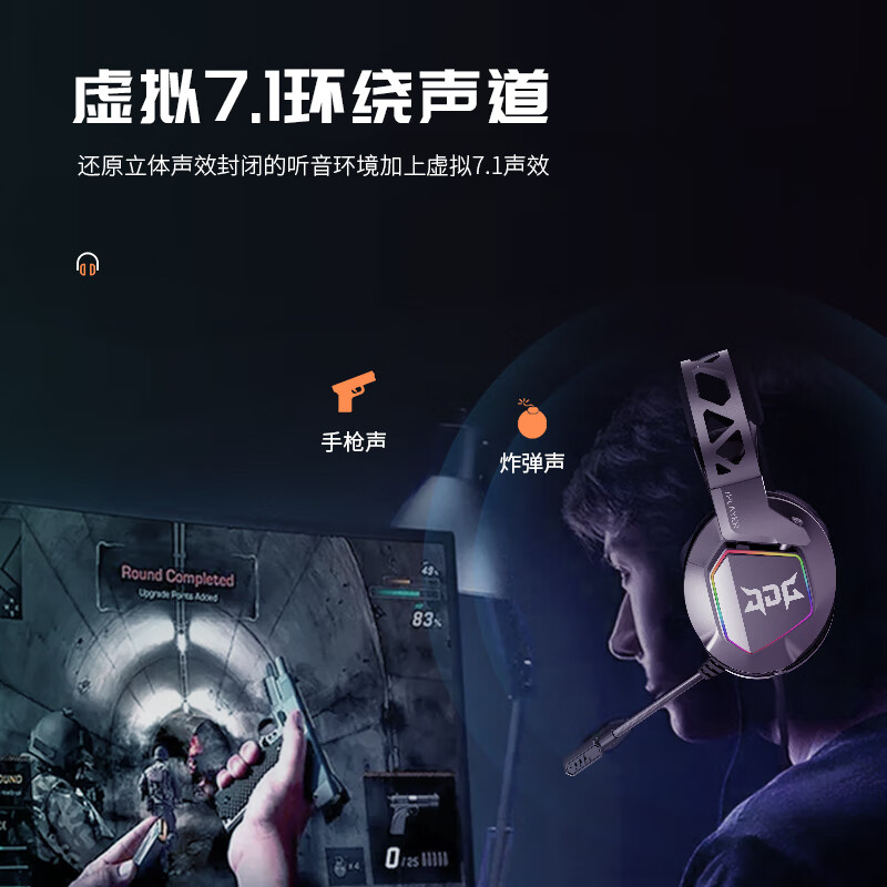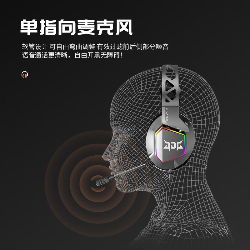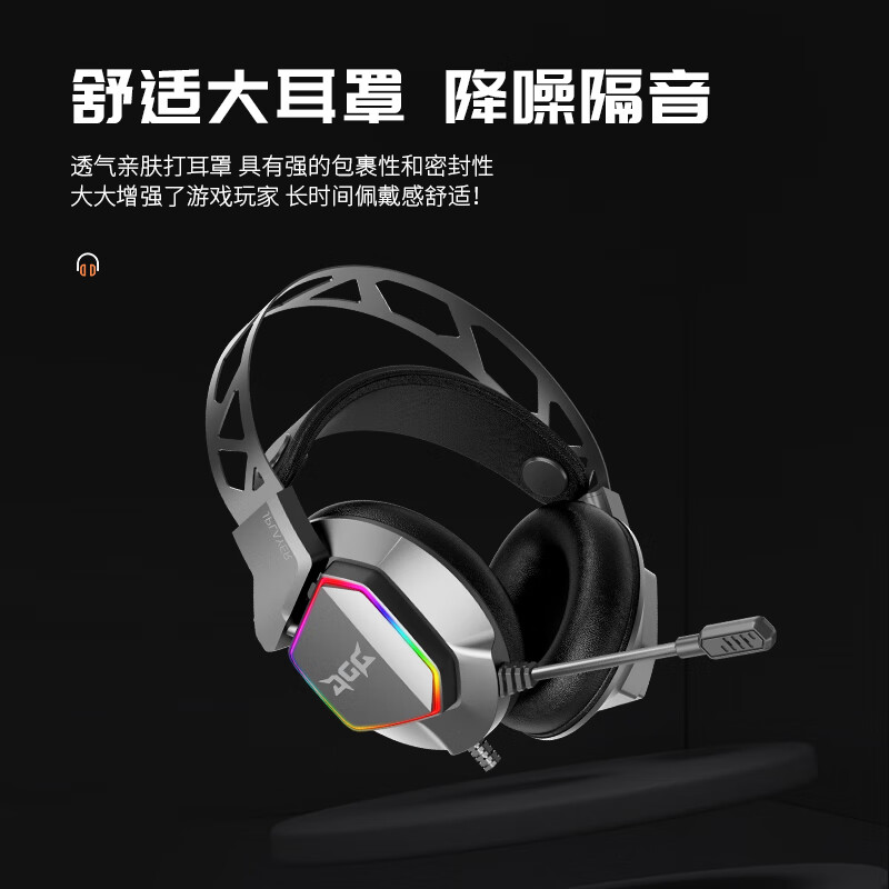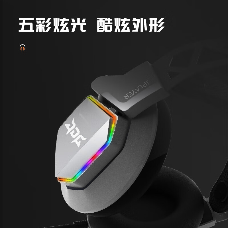这款耳机使用透气亲肤大耳罩,有强包裹性和密封性,舒适隔音。支持虚拟7.1环绕声道。使用软管单指向麦克风。使用50mm大尺寸驱动单元。使用自适应悬浮头梁,舒适佩戴。耳机外壳带有五彩炫光灯效。使用耐用线材,带有线控按钮。