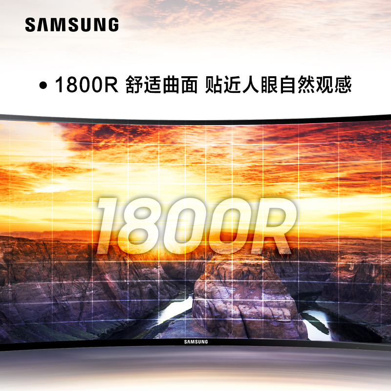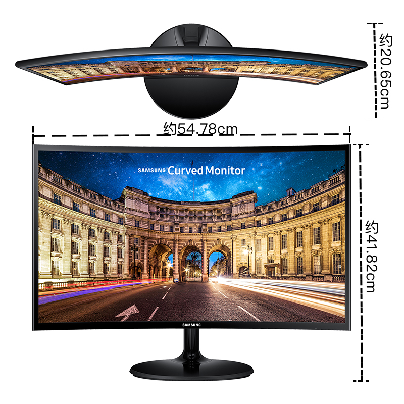 三星 C24F390FH 曲面显示器是三星2016年推出的新品显示器,最典型的一点就是用上了最新的1800R曲率面板,23.8英寸大小显示器上仍然有明显的弧度。VA面板,178°/178°可视角度,亮度250cd/m2,对比度3000:1,响应时间4ms。分辨率1920×1080,配合24英寸大小面板正合适。带有VGA、HDMI和耳机接口各一个。