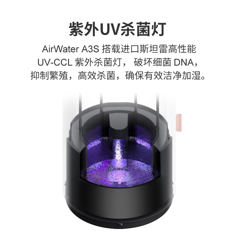 秒新于2021年9月推出全新AirWater A3S加湿器,加湿量1400mL/h,内置高浓度负离子发生器,对空气利用高压放电效应,产生出大量的负氧离子,加湿的同时让呼吸更为舒适健康。采用进口斯坦雷 70mm UV-CCL紫外杀菌灯,7*24h照射水箱,保证放射照度和时间, 与上一代A3不同的是,A3S通过增加照射面积进一步提升杀菌效果。为了便于对加湿器进行更为深入彻底的清洗,A3S 对加湿滤网组件进行了结构上的全新升级,其中扬水器采用无线供电技术,减少物理链接,不漏电更安全,拆卸也变得更为方便,轻轻一按,即可拿出;向上一拉,即可打开管路,更好的消除清洗死角。此外,这次A3S在珍珠白的基础上增加了金属银配色,满足多样化的审美需求。外观造型和A3完全一样,采用极简圆柱机身,搭配真空镀膜的黑色加水穹顶+多功能指示灯。