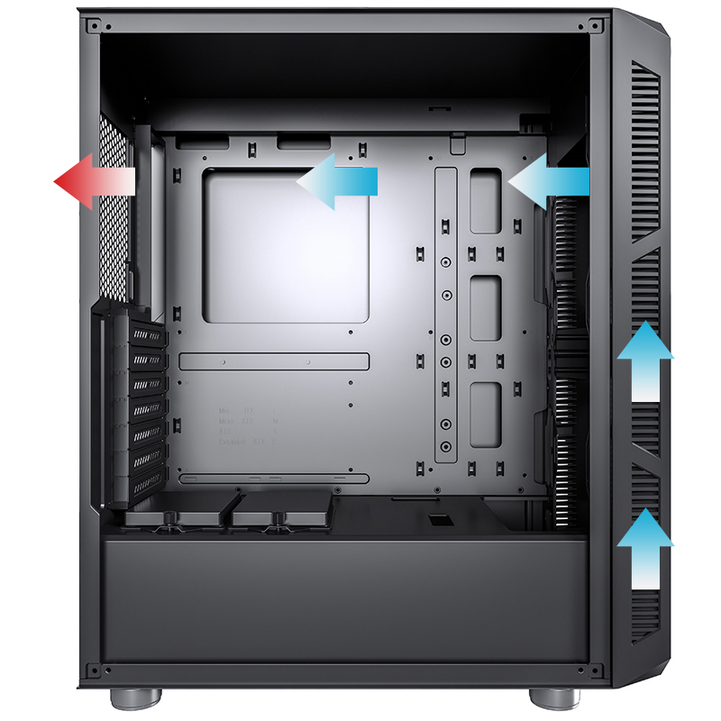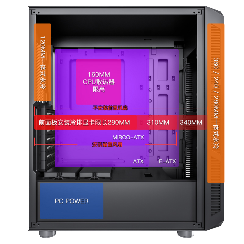 黑曼巴 F1支持EATX/ATX/MATX/ITX主板,CPU散热器现高160mm,显卡限长340mm,电源限长140mm,前板3*120mm风扇位,后板1*120mm风扇位,支持360mm水冷,标配3把风扇,配备2*HHD、4*SSD共6个风扇位,前板侧面进风,前部、两侧、顶部环绕静音棉,尺寸为478*407*210mm。