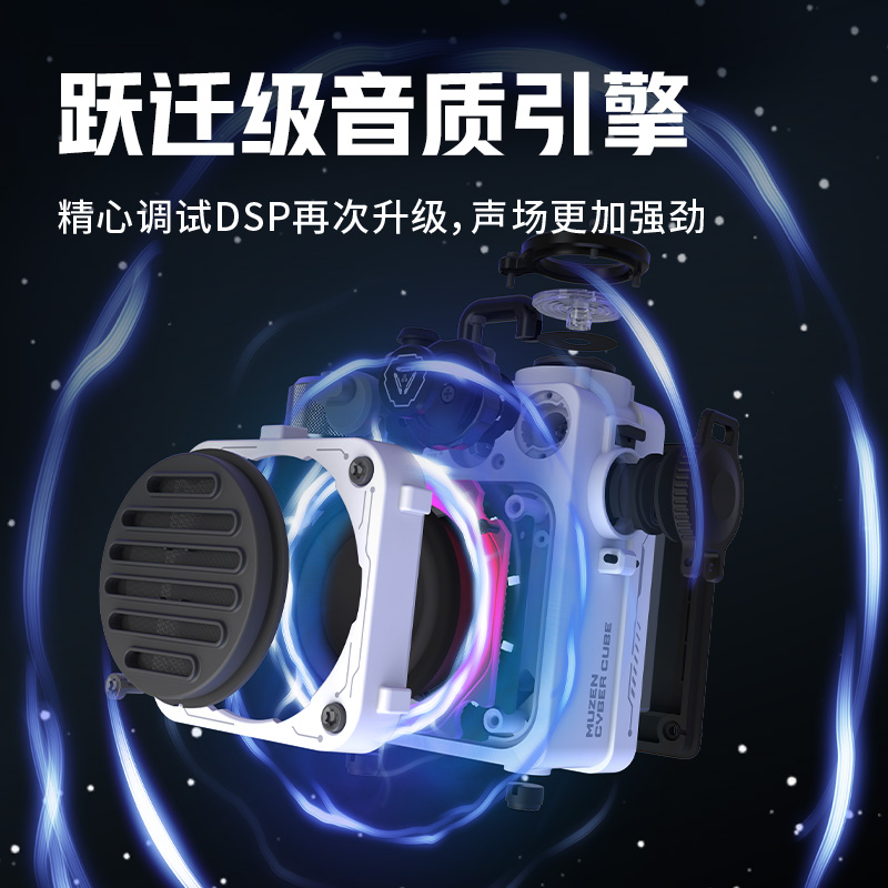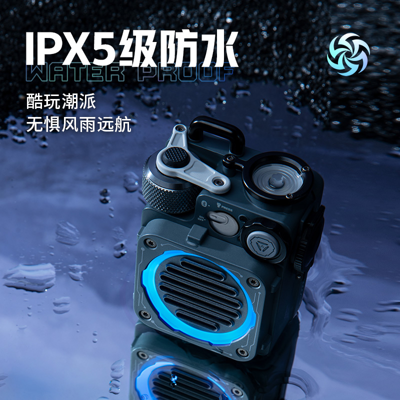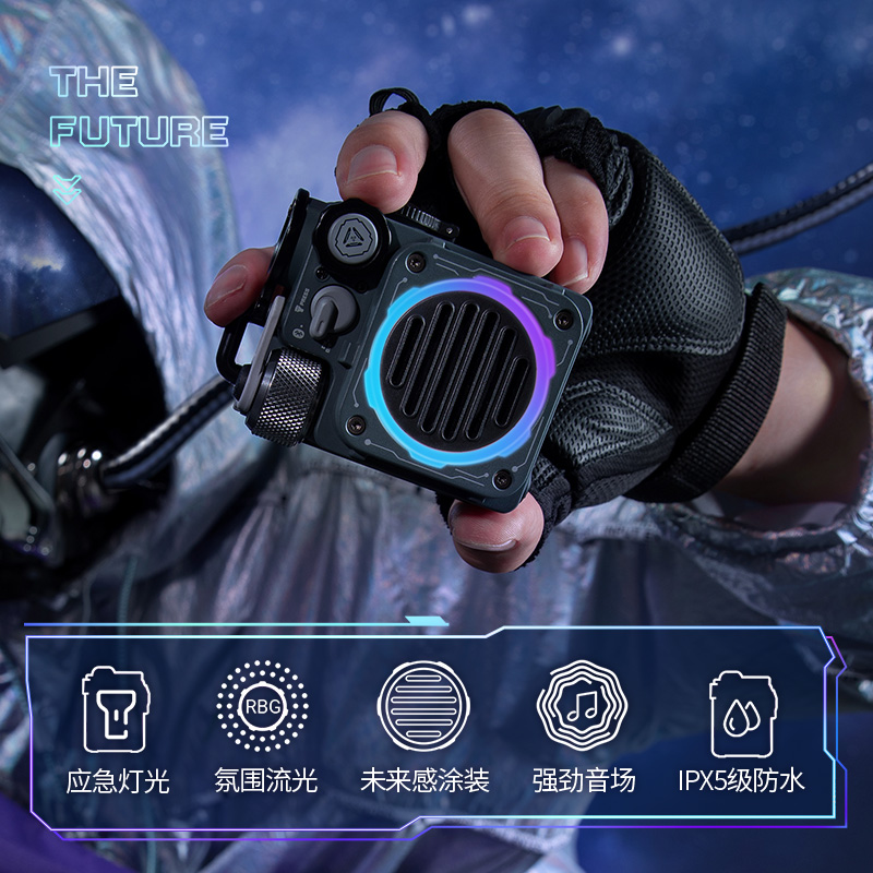 这款蓝牙音箱采用金属机身,未来感涂装,机械美学设计,拥有氛围流光RGB灯效,精心调试DPS,声场更加强劲,关闭灯光状态下最大续航约10h+;支持IPX5级防水,拥有手电筒功能,并且支持多种手电筒灯光模式,金属滚花音量旋钮,齿轮咬合卡卡棘轮手感,段落感十足。